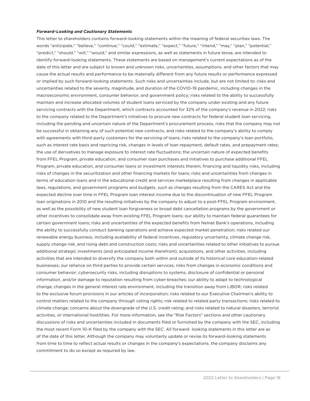 2022 Letter to Shareholders | Page 16 Forward-Looking and Cautionary Statements This letter to shareholders contains forward-looking statements within the meaning of federal securities laws. The words “anticipate,” “believe,” “continue,” “could,” “estimate,” “expect,” “future,” “intend,” “may,” “plan,” “potential,” “predict,” “should,” “will,” “would,” and similar expressions, as well as statements in future tense, are intended to identify forward-looking statements. These statements are based on management's current expectations as of the date of this letter and are subject to known and unknown risks, uncertainties, assumptions, and other factors that may cause the actual results and performance to be materially different from any future results or performance expressed or implied by such forward-looking statements. Such risks and uncertainties include, but are not limited to: risks and uncertainties related to the severity, magnitude, and duration of the COVID-19 pandemic, including changes in the macroeconomic environment, consumer behavior, and government policy; risks related to the ability to successfully maintain and increase allocated volumes of student loans serviced by the company under existing and any future servicing contracts with the Department, which contracts accounted for 32% of the company's revenue in 2022; risks to the company related to the Department's initiatives to procure new contracts for federal student loan servicing, including the pending and uncertain nature of the Department's procurement process, risks that the company may not be successful in obtaining any of such potential new contracts, and risks related to the company's ability to comply with agreements with third-party customers for the servicing of loans; risks related to the company's loan portfolio, such as interest rate basis and repricing risk, changes in levels of loan repayment, default rates, and prepayment rates; the use of derivatives to manage exposure to interest rate fluctuations; the uncertain nature of expected benefits from FFEL Program, private education, and consumer loan purchases and initiatives to purchase additional FFEL Program, private education, and consumer loans or investment interests therein; financing and liquidity risks, including risks of changes in the securitization and other financing markets for loans; risks and uncertainties from changes in terms of education loans and in the educational credit and services marketplace resulting from changes in applicable laws, regulations, and government programs and budgets, such as changes resulting from the CARES Act and the expected decline over time in FFEL Program loan interest income due to the discontinuation of new FFEL Program loan originations in 2010 and the resulting initiatives by the company to adjust to a post-FFEL Program environment, as well as the possibility of new student loan forgiveness or broad debt cancellation programs by the government or other incentives to consolidate away from existing FFEL Program loans; our ability to maintain federal guarantees for certain government loans; risks and uncertainties of the expected benefits from Nelnet Bank’s operations, including the ability to successfully conduct banking operations and achieve expected market penetration; risks related our renewable energy business, including availability of federal incentives, regulatory uncertainty, climate change risk, supply change risk, and rising debt and construction costs; risks and uncertainties related to other initiatives to pursue additional strategic investments (and anticipated income therefrom), acquisitions, and other activities, including activities that are intended to diversify the company both within and outside of its historical core education-related businesses; our reliance on third parties to provide certain services; risks from changes in economic conditions and consumer behavior; cybersecurity risks, including disruptions to systems, disclosure of confidential or personal information, and/or damage to reputation resulting from cyber-breaches; our ability to adapt to technological change; changes in the general interest rate environment, including the transition away from LIBOR; risks related to the exclusive forum provisions in our articles of incorporation; risks related to our Executive Chairman’s ability to control matters related to the company through voting rights; risk related to related party transactions; risks related to climate change; concerns about the downgrade of the U.S. credit rating; and risks related to natural disasters, terrorist activities, or international hostilities. For more information, see the "Risk Factors" sections and other cautionary discussions of risks and uncertainties included in documents filed or furnished by the company with the SEC, including the most recent Form 10-K filed by the company with the SEC. All forward- looking statements in this letter are as of the date of this letter. Although the company may voluntarily update or revise its forward-looking statements from time to time to reflect actual results or changes in the company's expectations, the company disclaims any commitment to do so except as required by law.