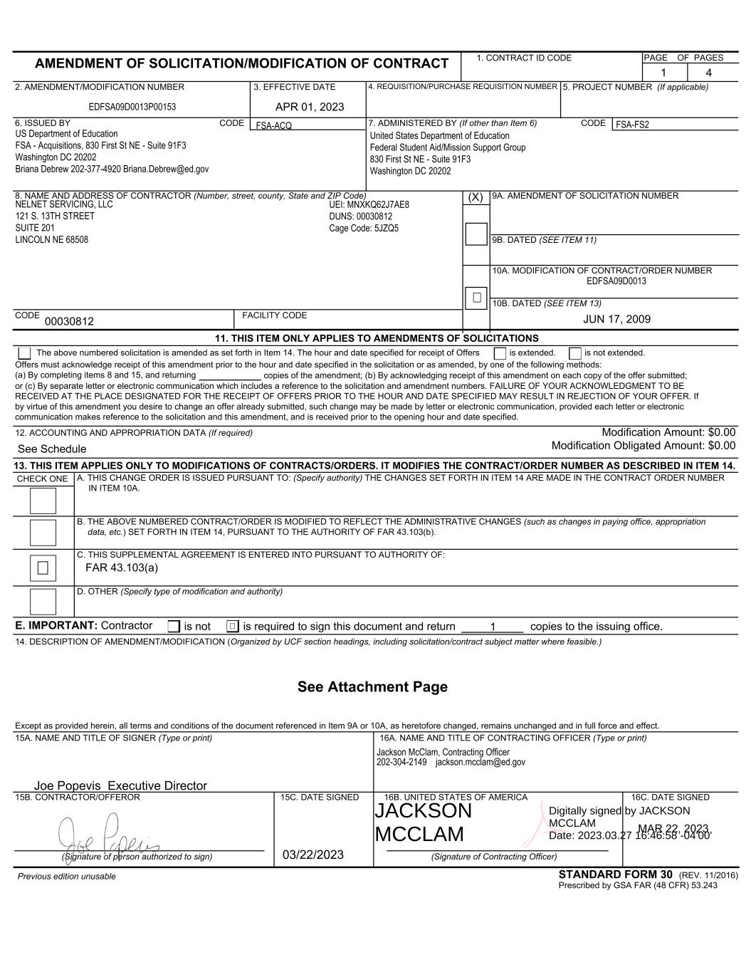 Offers must acknowledge receipt of this amendment prior to the hour and date specified in the solicitation or as amended, by one of the following methods: (a) By completing items 8 and 15, and returning or (c) By separate letter or electronic communication which includes a reference to the solicitation and amendment numbers. FAILURE OF YOUR ACKNOWLEDGMENT TO BE RECEIVED AT THE PLACE DESIGNATED FOR THE RECEIPT OF OFFERS PRIOR TO THE HOUR AND DATE SPECIFIED MAY RESULT IN REJECTION OF YOUR OFFER. If by virtue of this amendment you desire to change an offer already submitted, such change may be made by letter or electronic communication, provided each letter or electronic communication makes reference to the solicitation and this amendment, and is received prior to the opening hour and date specified. E. IMPORTANT: Contractor is not is required to sign this document and return copies to the issuing office. AMENDMENT OF SOLICITATION/MODIFICATION OF CONTRACT 1. CONTRACT ID CODE 2. AMENDMENT/MODIFICATION NUMBER 3. EFFECTIVE DATE 4. REQUISITION/PURCHASE REQUISITION NUMBER 5. PROJECT NUMBER (If applicable) 7. ADMINISTERED BY (If other than Item 6) CODE STANDARD FORM 30 (REV. 11/2016) Prescribed by GSA FAR (48 CFR) 53.243 FACILITY CODE 9A. AMENDMENT OF SOLICITATION NUMBER 9B. DATED (SEE ITEM 11) 10A. MODIFICATION OF CONTRACT/ORDER NUMBER 10B. DATED (SEE ITEM 13) 11. THIS ITEM ONLY APPLIES TO AMENDMENTS OF SOLICITATIONS The above numbered solicitation is amended as set forth in Item 14. The hour and date specified for receipt of Offers is extended. is not extended. 12. ACCOUNTING AND APPROPRIATION DATA (If required) copies of the amendment; (b) By acknowledging receipt of this amendment on each copy of the offer submitted; 13. THIS ITEM APPLIES ONLY TO MODIFICATIONS OF CONTRACTS/ORDERS. IT MODIFIES THE CONTRACT/ORDER NUMBER AS DESCRIBED IN ITEM 14. CHECK ONE A. THIS CHANGE ORDER IS ISSUED PURSUANT TO: (Specify authority) THE CHANGES SET FORTH IN ITEM 14 ARE MADE IN THE CONTRACT ORDER NUMBER IN ITEM 10A. B. THE ABOVE NUMBERED CONTRACT/ORDER IS MODIFIED TO REFLECT THE ADMINISTRATIVE CHANGES (such as changes in paying office, appropriation data, etc.) SET FORTH IN ITEM 14, PURSUANT TO THE AUTHORITY OF FAR 43.103(b). C. THIS SUPPLEMENTAL AGREEMENT IS ENTERED INTO PURSUANT TO AUTHORITY OF: D. OTHER (Specify type of modification and authority) Except as provided herein, all terms and conditions of the document referenced in Item 9A or 10A, as heretofore changed, remains unchanged and in full force and effect. 15C. DATE SIGNED 15A. NAME AND TITLE OF SIGNER (Type or print) 16C. DATE SIGNED 16A. NAME AND TITLE OF CONTRACTING OFFICER (Type or print) 14. DESCRIPTION OF AMENDMENT/MODIFICATION (Organized by UCF section headings, including solicitation/contract subject matter where feasible.) PAGE OF PAGES 6. ISSUED BY CODE 8. NAME AND ADDRESS OF CONTRACTOR (Number, street, county, State and ZIP Code) (X) CODE 15B. CONTRACTOR/OFFEROR (Signature of person authorized to sign) 16B. UNITED STATES OF AMERICA (Signature of Contracting Officer) Previous edition unusable See Attachment Page 1 4 EDFSA09D0013P00153 APR 01, 2023 FSA-ACQ US Department of Education FSA - Acquisitions, 830 First St NE - Suite 91F3 Washington DC 20202 Briana Debrew 202-377-4920 Briana.Debrew@ed.gov FSA-FS2 United States Department of Education Federal Student Aid/Mission Support Group 830 First St NE - Suite 91F3 Washington DC 20202 00030812 EDFSA09D0013 JUN 17, 2009 See Schedule ✖ FAR 43.103(a) ✖ 1 Jackson McClam, Contracting Officer 202-304-2149 jackson.mcclam@ed.gov MAR 22, 2023 UEI: MNXKQ62J7AE8 DUNS: 00030812 Cage Code: 5JZQ5 NELNET SERVICING, LLC 121 S. 13TH STREET SUITE 201 LINCOLN NE 68508 Modification Amount: $0.00 Modification Obligated Amount: $0.00 ✖ JACKSON MCCLAM Digitally signed by JACKSON MCCLAM Date: 2023.03.27 16:46:58 -04'00'