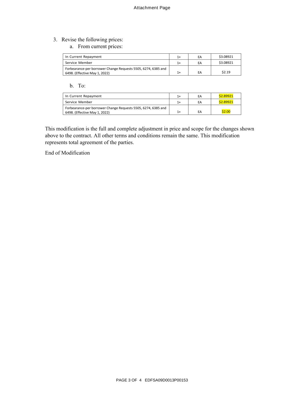 Attachment Page PAGE 3 OF 4 EDFSA09D0013P00153 3. Revise the following prices: a. From current prices: In Current Repayment 1+ EA $3.08921 Service Member 1+ EA $3.08921 Forbearance-per borrower Change Requests 5505, 6274, 6385 and 6498. (Effective May 1, 2022) 1+ EA $2.19 b. To: In Current Repayment 1+ EA $2.89921 Service Member 1+ EA $2.89921 Forbearance-per borrower Change Requests 5505, 6274, 6385 and 6498. (Effective May 1, 2022) 1+ EA $2.00 This modification is the full and complete adjustment in price and scope for the changes shown above to the contract. All other terms and conditions remain the same. This modification represents total agreement of the parties. End of Modification