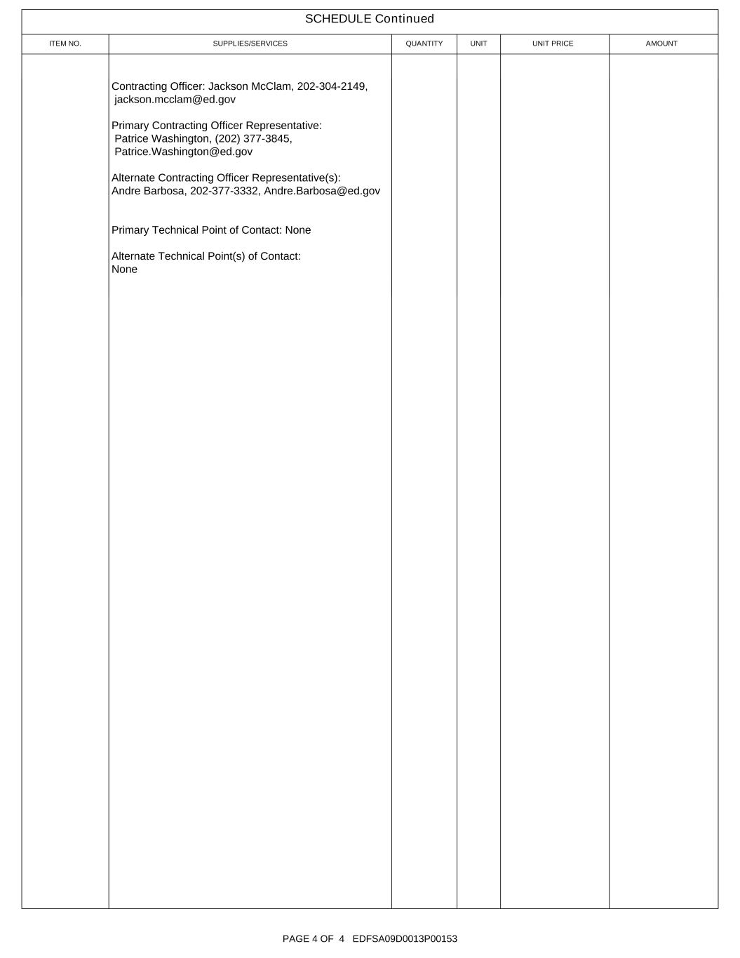 SCHEDULE Continued ITEM NO. SUPPLIES/SERVICES QUANTITY UNIT UNIT PRICE AMOUNT Contracting Officer: Jackson McClam, 202-304-2149, jackson.mcclam@ed.gov Primary Contracting Officer Representative: Patrice Washington, (202) 377-3845, Patrice.Washington@ed.gov Alternate Contracting Officer Representative(s): Andre Barbosa, 202-377-3332, Andre.Barbosa@ed.gov Primary Technical Point of Contact: None Alternate Technical Point(s) of Contact: None PAGE 4 OF 4 EDFSA09D0013P00153