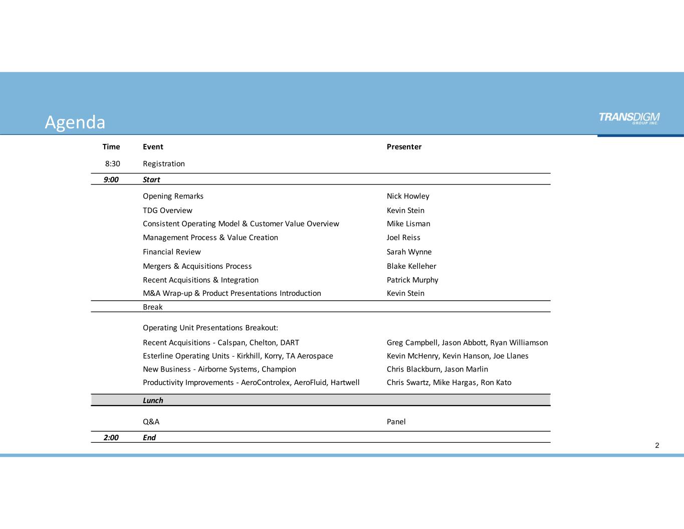 Agenda Time Event Presenter 8:30 Registration  9:00 Start Opening Remarks Nick Howley TDG Overview Kevin Stein Consistent Operating Model & Customer Value Overview Mike Lisman Management Process & Value Creation Joel Reiss Financial Review  Sarah Wynne Mergers & Acquisitions Process Blake Kelleher Recent Acquisitions & Integration  Patrick Murphy M&A Wrap‐up & Product Presentations Introduction Kevin Stein Break Operating Unit Presentations Breakout: Recent Acquisitions ‐ Calspan, Chelton, DART Greg Campbell, Jason Abbott, Ryan Williamson Esterline Operating Units ‐ Kirkhill, Korry, TA Aerospace   Kevin McHenry, Kevin Hanson, Joe Llanes New Business ‐ Airborne Systems, Champion Chris Blackburn, Jason Marlin Productivity Improvements ‐ AeroControlex, AeroFluid, Hartwell Chris Swartz, Mike Hargas, Ron Kato Lunch Q&A Panel 2:00 End 2
