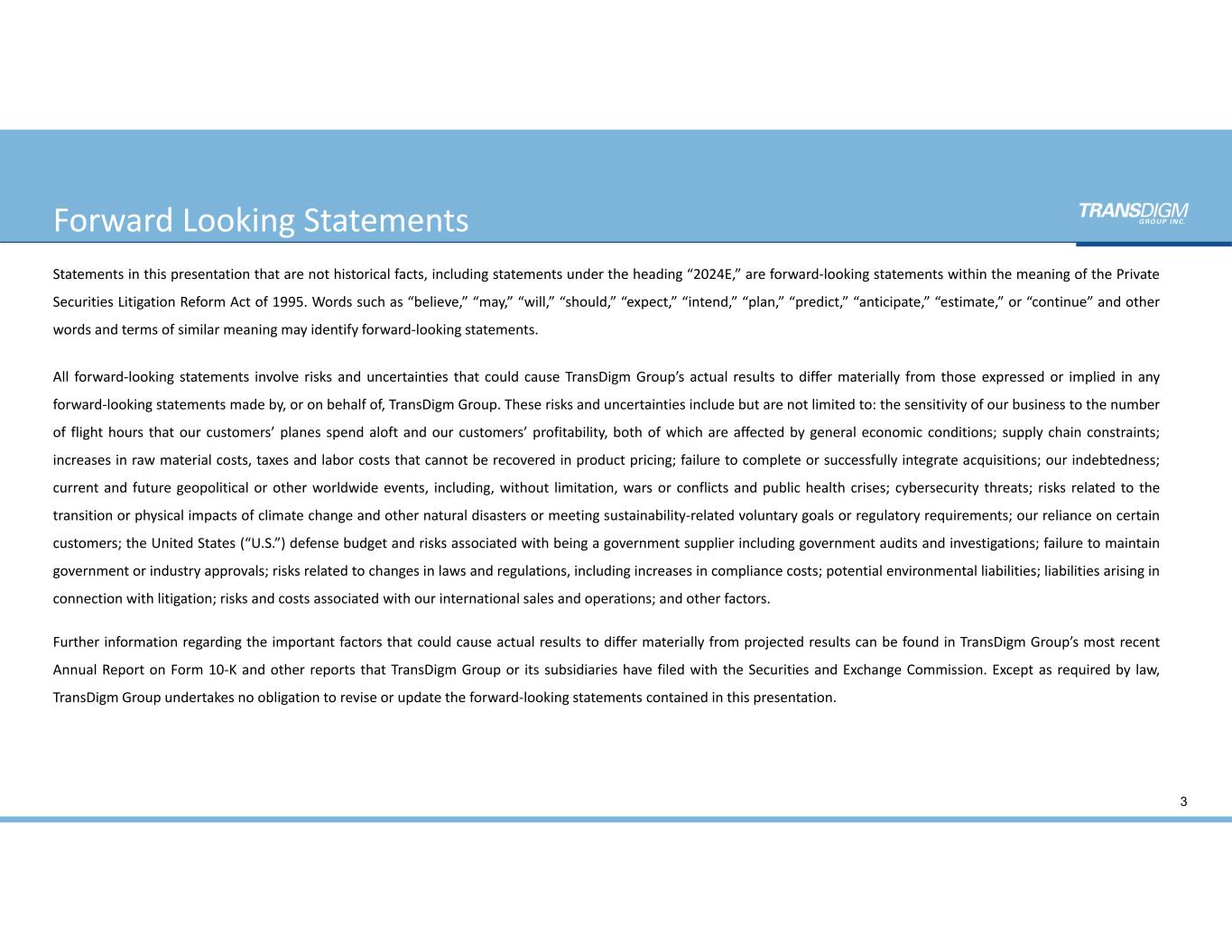 Forward Looking Statements Statements in this presentation that are not historical facts, including statements under the heading “2024E,” are forward‐looking statements within the meaning of the Private Securities Litigation Reform Act of 1995. Words such as “believe,” “may,” “will,” “should,” “expect,” “intend,” “plan,” “predict,” “anticipate,” “estimate,” or “continue” and other words and terms of similar meaning may identify forward‐looking statements. All forward‐looking statements involve risks and uncertainties that could cause TransDigm Group’s actual results to differ materially from those expressed or implied in any forward‐looking statements made by, or on behalf of, TransDigm Group. These risks and uncertainties include but are not limited to: the sensitivity of our business to the number of flight hours that our customers’ planes spend aloft and our customers’ profitability, both of which are affected by general economic conditions; supply chain constraints; increases in raw material costs, taxes and labor costs that cannot be recovered in product pricing; failure to complete or successfully integrate acquisitions; our indebtedness; current and future geopolitical or other worldwide events, including, without limitation, wars or conflicts and public health crises; cybersecurity threats; risks related to the transition or physical impacts of climate change and other natural disasters or meeting sustainability‐related voluntary goals or regulatory requirements; our reliance on certain customers; the United States (“U.S.”) defense budget and risks associated with being a government supplier including government audits and investigations; failure to maintain government or industry approvals; risks related to changes in laws and regulations, including increases in compliance costs; potential environmental liabilities; liabilities arising in connection with litigation; risks and costs associated with our international sales and operations; and other factors. Further information regarding the important factors that could cause actual results to differ materially from projected results can be found in TransDigm Group’s most recent Annual Report on Form 10‐K and other reports that TransDigm Group or its subsidiaries have filed with the Securities and Exchange Commission. Except as required by law, TransDigm Group undertakes no obligation to revise or update the forward‐looking statements contained in this presentation. 3