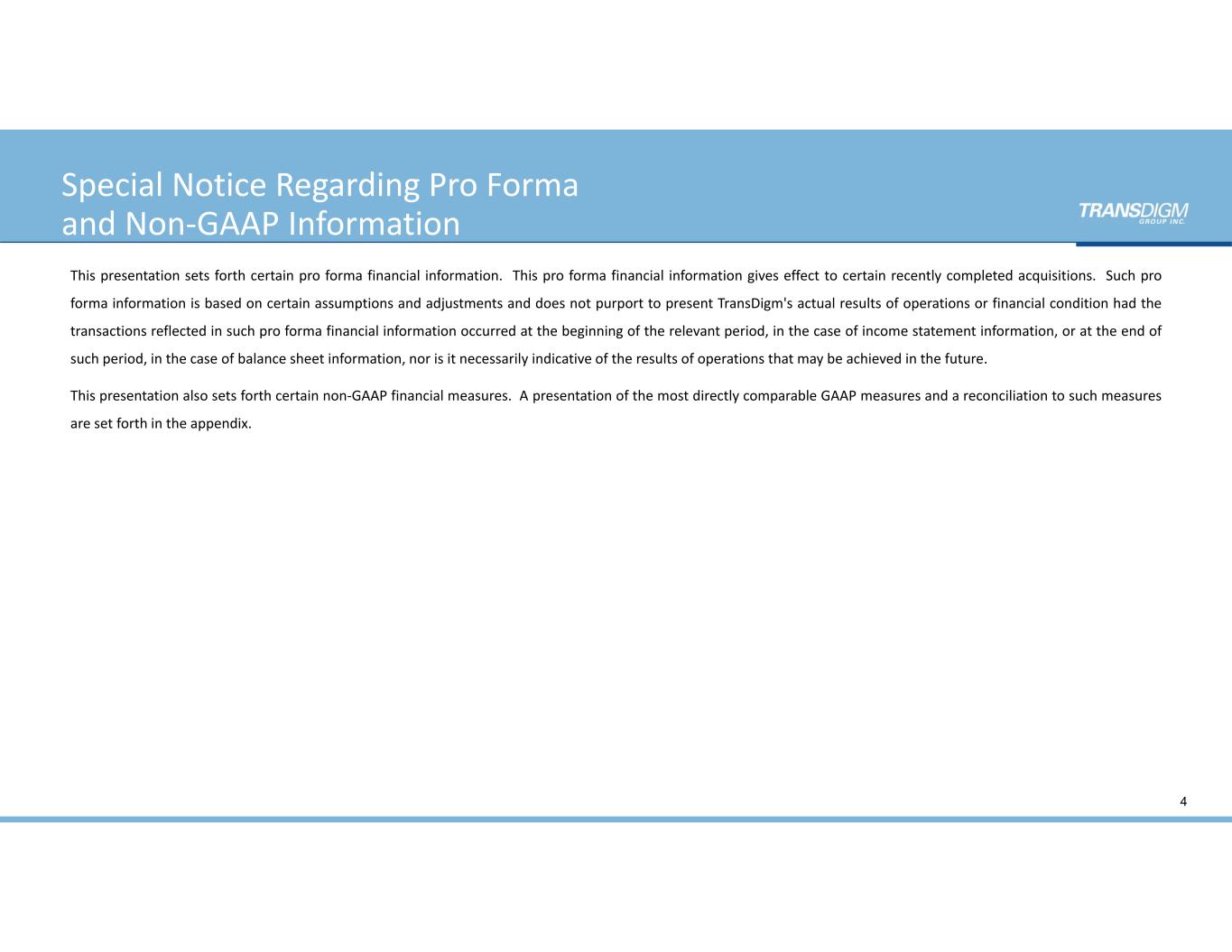Special Notice Regarding Pro Forma  and Non‐GAAP Information This presentation sets forth certain pro forma financial information. This pro forma financial information gives effect to certain recently completed acquisitions. Such pro forma information is based on certain assumptions and adjustments and does not purport to present TransDigm's actual results of operations or financial condition had the transactions reflected in such pro forma financial information occurred at the beginning of the relevant period, in the case of income statement information, or at the end of such period, in the case of balance sheet information, nor is it necessarily indicative of the results of operations that may be achieved in the future. This presentation also sets forth certain non‐GAAP financial measures. A presentation of the most directly comparable GAAP measures and a reconciliation to such measures are set forth in the appendix. 4