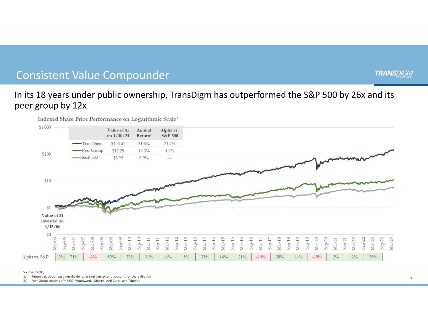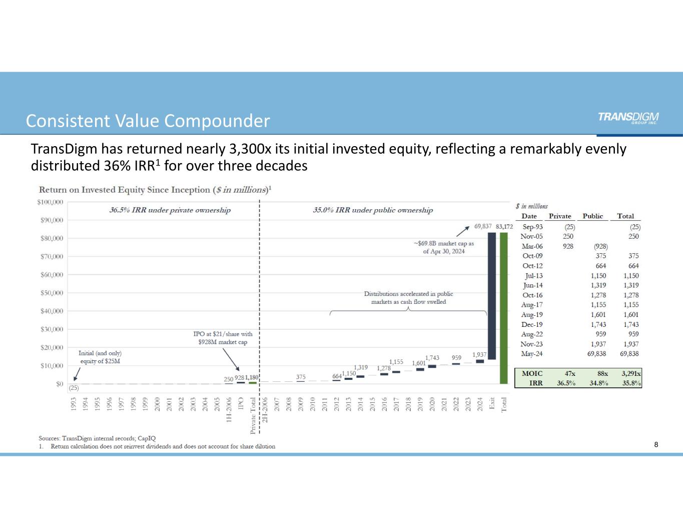 8 Consistent Value Compounder TransDigm has returned nearly 3,300x its initial invested equity, reflecting a remarkably evenly  distributed 36% IRR1 for over three decades