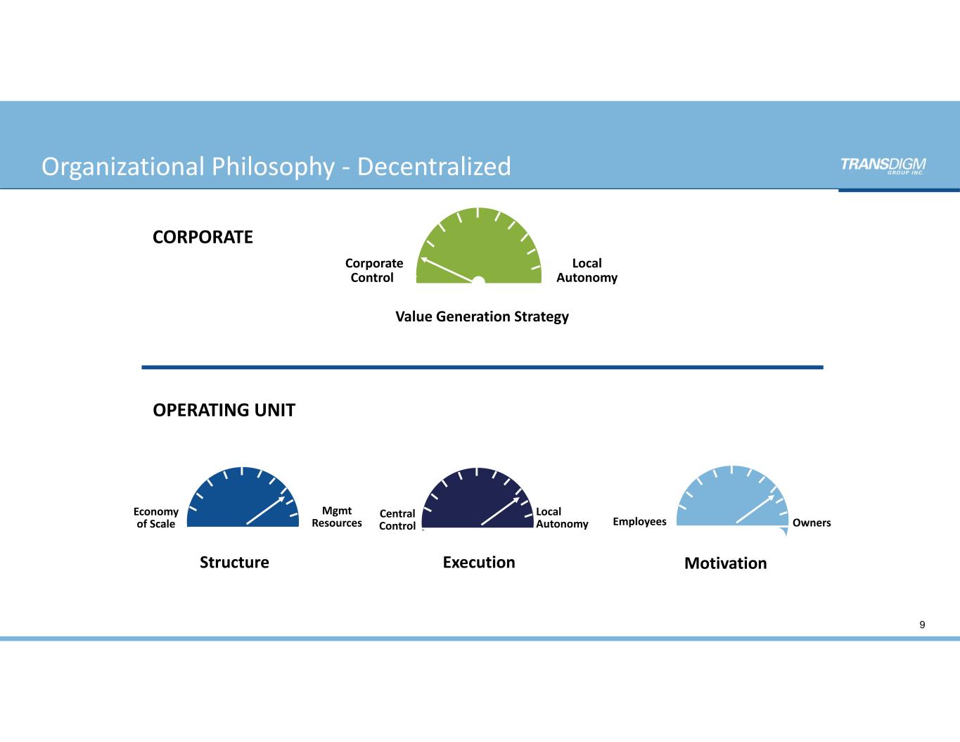Corporate  Control Local Autonomy Economy of Scale Mgmt Resources Value Generation Strategy Structure Execution Motivation Central Control Local  Autonomy Employees Owners CORPORATE OPERATING UNIT Organizational Philosophy ‐ Decentralized 9