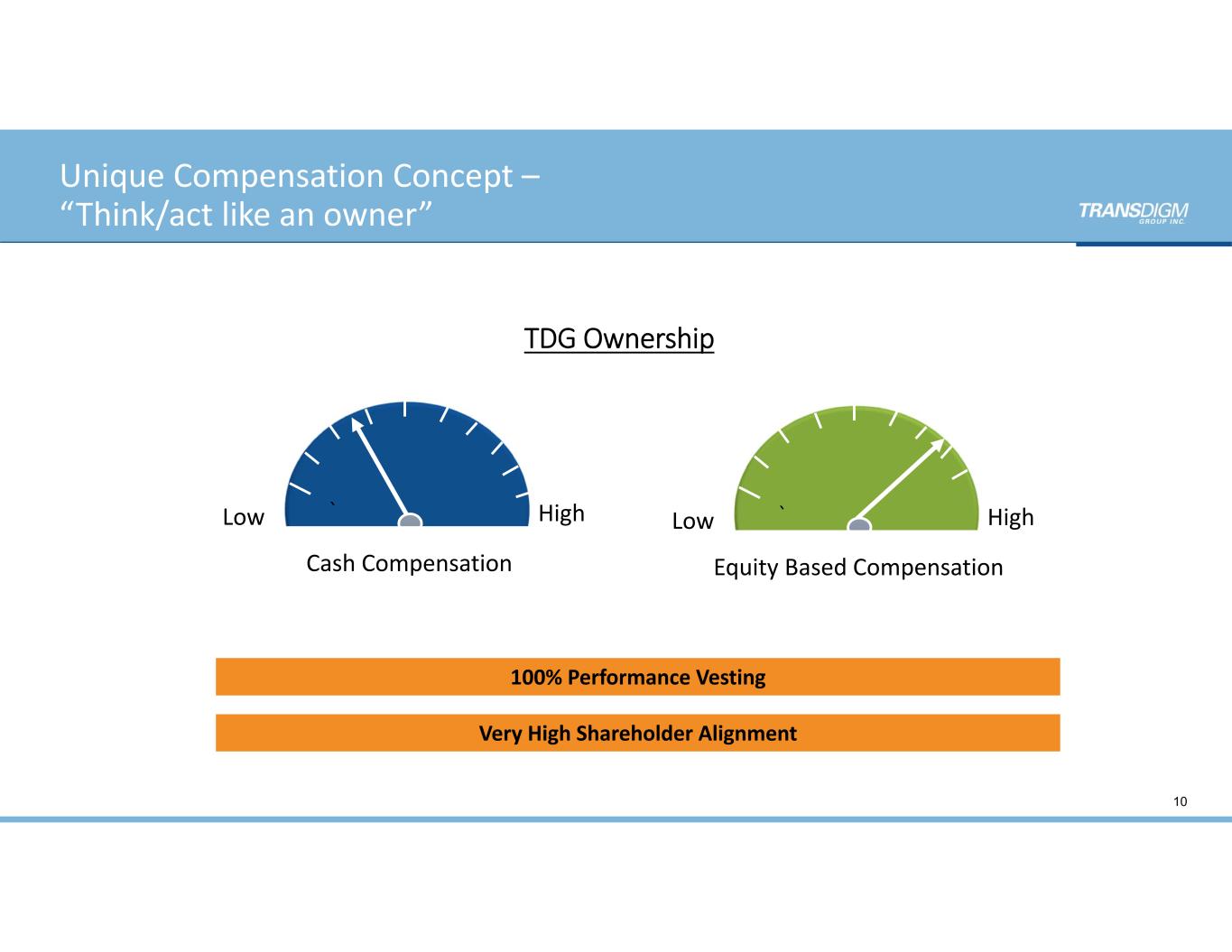 Unique Compensation Concept – “Think/act like an owner” Low ` High Cash Compensation  100% Performance Vesting TDG Ownership Low ` High Equity Based Compensation  Very High Shareholder Alignment 10