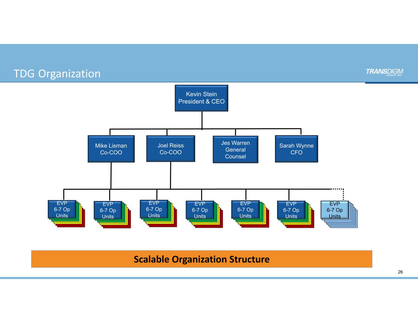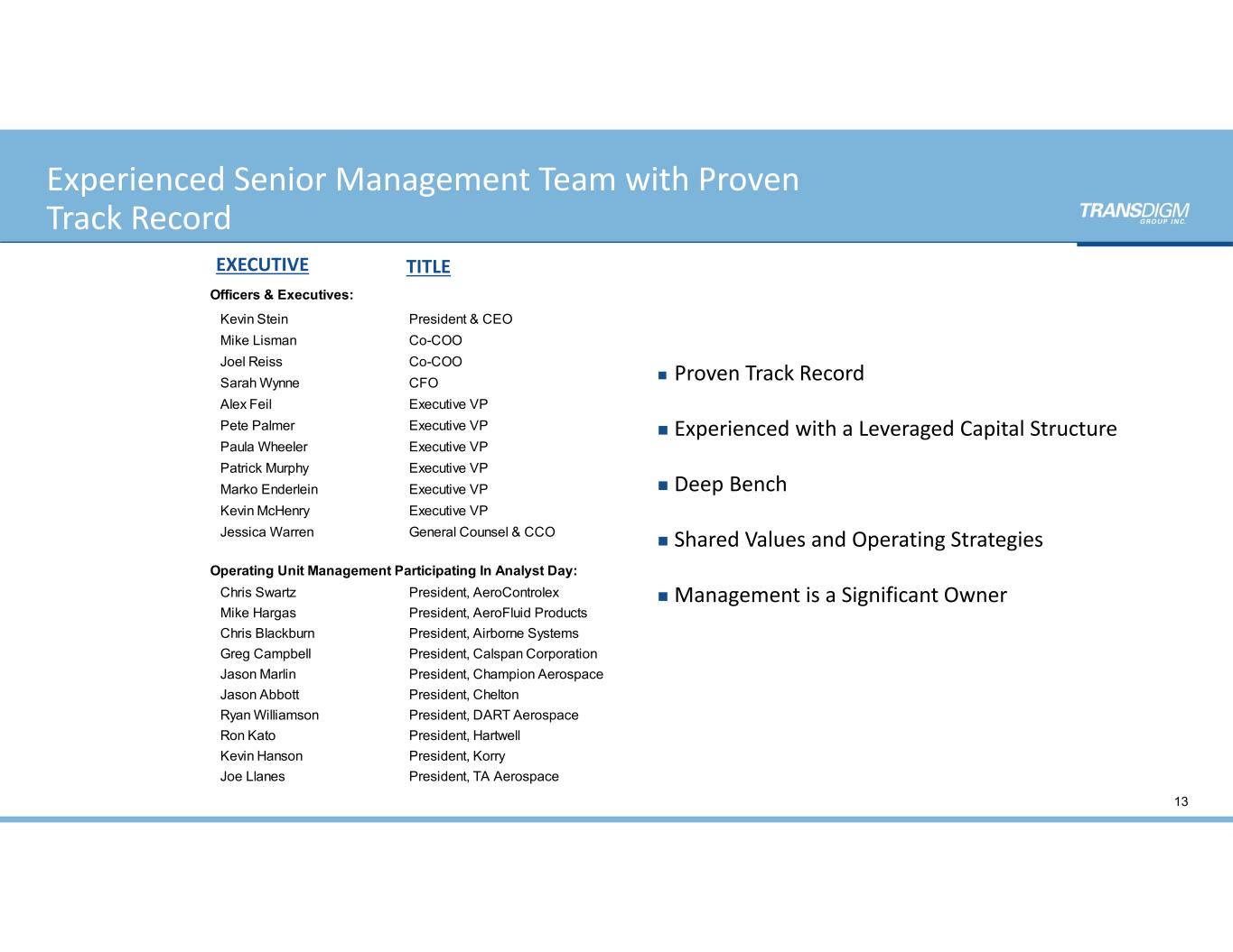 Experienced Senior Management Team with Proven  Track Record  13 EXECUTIVE TITLE Officers & Executives: Kevin Stein President & CEO Mike Lisman Co-COO Joel Reiss Co-COO Sarah Wynne CFO Alex Feil Executive VP Pete Palmer Executive VP Paula Wheeler Executive VP Patrick Murphy Executive VP Marko Enderlein Executive VP Kevin McHenry Executive VP Jessica Warren General Counsel & CCO Chris Swartz President, AeroControlex Mike Hargas President, AeroFluid Products Chris Blackburn President, Airborne Systems Greg Campbell President, Calspan Corporation Jason Marlin President, Champion Aerospace Jason Abbott President, Chelton Ryan Williamson President, DART Aerospace Ron Kato President, Hartwell Kevin Hanson President, Korry Joe Llanes President, TA Aerospace Operating Unit Management Participating In Analyst Day:  Proven Track Record  Experienced with a Leveraged Capital Structure  Deep Bench  Shared Values and Operating Strategies Management is a Significant Owner