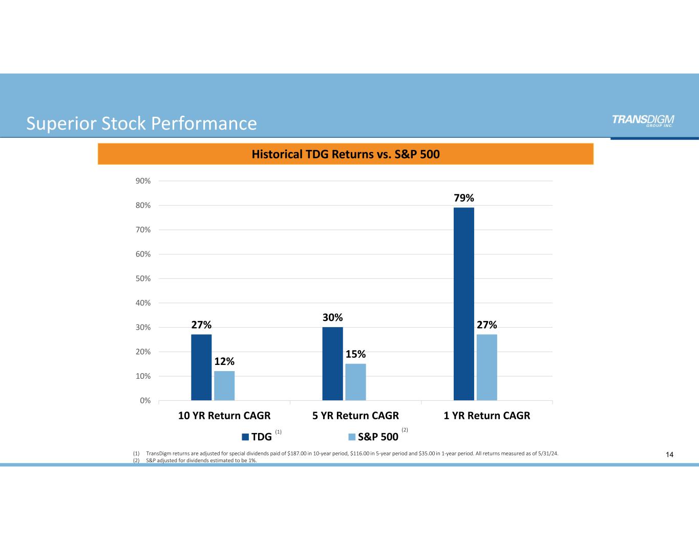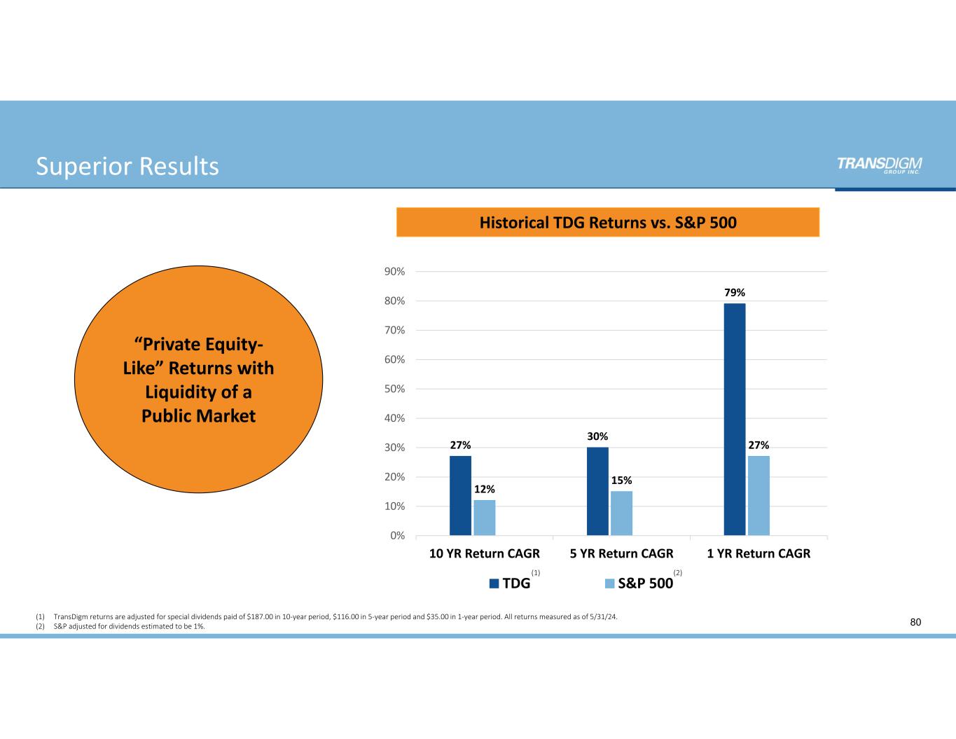 Superior Results 80(1) TransDigm returns are adjusted for special dividends paid of $187.00 in 10‐year period, $116.00 in 5‐year period and $35.00 in 1‐year period. All returns measured as of 5/31/24. (2) S&P adjusted for dividends estimated to be 1%. 27% 30% 79% 12% 15% 27% 0% 10% 20% 30% 40% 50% 60% 70% 80% 90% 10 YR Return CAGR 5 YR Return CAGR 1 YR Return CAGR TDG S&P 500 (2)(1) Historical TDG Returns vs. S&P 500 “Private Equity‐ Like” Returns with  Liquidity of a  Public Market
