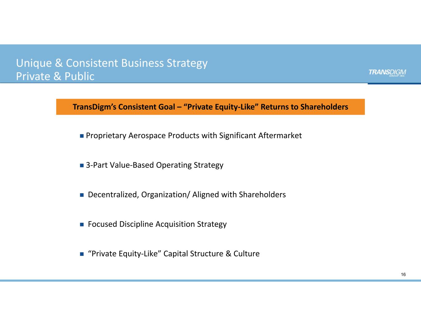Unique & Consistent Business Strategy Private & Public  Proprietary Aerospace Products with Significant Aftermarket  3‐Part Value‐Based Operating Strategy  Decentralized, Organization/ Aligned with Shareholders   Focused Discipline Acquisition Strategy  “Private Equity‐Like” Capital Structure & Culture TransDigm’s Consistent Goal – “Private Equity‐Like” Returns to Shareholders  16