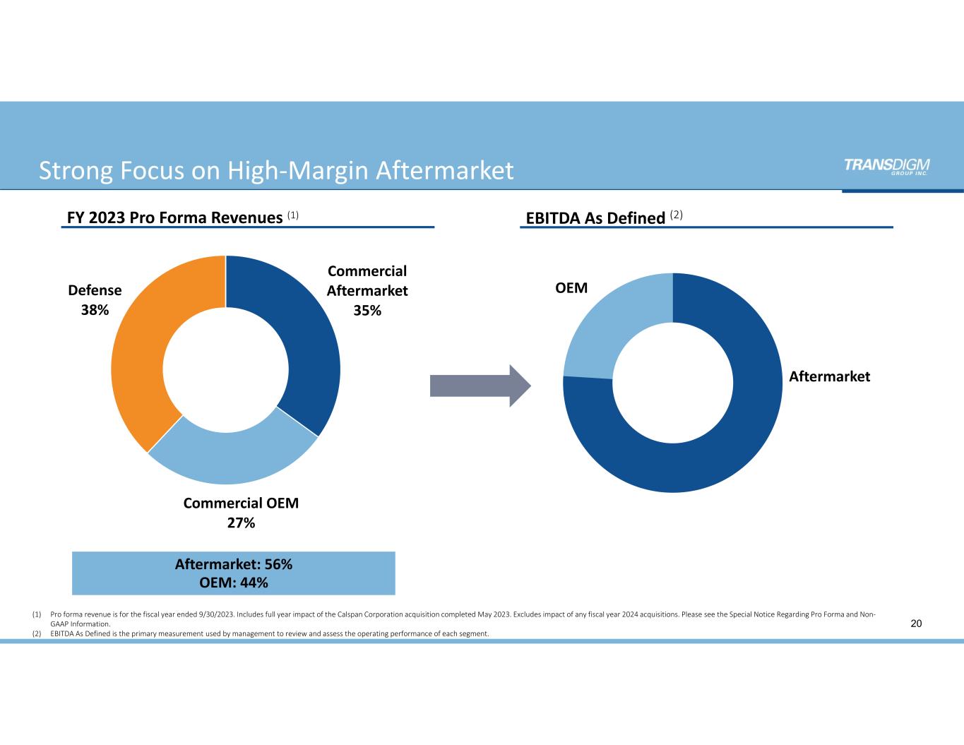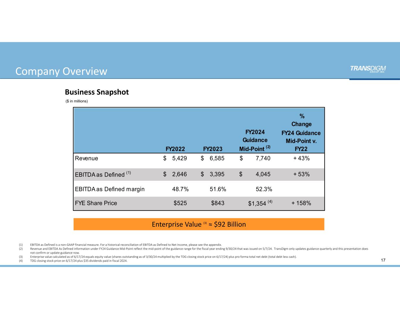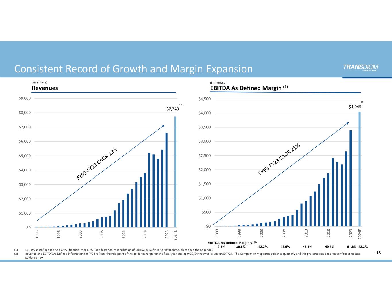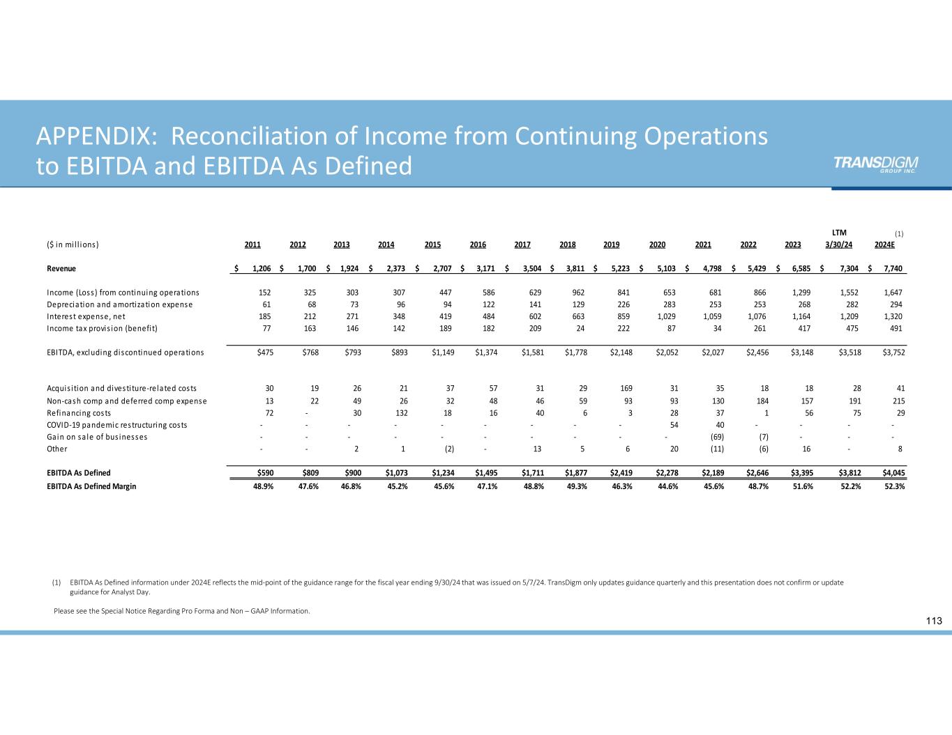 (1) APPENDIX:  Reconciliation of Income from Continuing Operations  to EBITDA and EBITDA As Defined 113 LTM ($ in mi l l ions) 2011 2012 2013 2014 2015 2016 2017 2018 2019 2020 2021 2022 2023 3/30/24 2024E Revenue 1,206$         1,700$         1,924$       2,373$         2,707$         3,171$        3,504$         3,811$        5,223$         5,103$         4,798$         5,429$        6,585$        7,304$          7,740$        Income (Loss ) from continuing operations 152              325              303            307              447              586             629              962             841              653              681              866             1,299          1,552            1,647          Depreciation and amortization expense 61                68                73              96                94                122             141              129             226              283              253              253             268             282               294             Interest expense, net 185              212              271            348              419              484             602              663             859              1,029           1,059           1,076          1,164          1,209            1,320          Income tax provis ion (benefi t) 77                163              146            142              189              182             209              24               222              87                34                261             417             475               491             EBITDA, excluding discontinued operations $475 $768 $793 $893 $1,149 $1,374 $1,581 $1,778 $2,148 $2,052 $2,027 $2,456 $3,148 $3,518 $3,752 Acquis i tion and divesti ture‐related costs 30 19 26 21 37 57 31 29 169 31 35 18 18 28 41 Non‐cash comp and deferred comp expense 13 22 49 26 32 48 46 59 93 93 130 184 157 191 215 Refinancing cos ts 72 ‐              30 132 18                16 40 6 3 28 37 1 56 75 29 COVID‐19 pandemic restructuring costs ‐              ‐             ‐           ‐             ‐             ‐           ‐             ‐             ‐            54 40 ‐            ‐            ‐              ‐             Gain on sa le of bus inesses ‐              ‐              ‐             ‐               ‐               ‐             ‐               ‐             ‐              ‐               (69)               (7)                ‐              ‐                ‐              Other ‐              ‐              2                1                  (2)                 ‐             13                5                 6                  20 (11)               (6)                16               ‐                8                 EBITDA As Defined $590 $809 $900 $1,073 $1,234 $1,495 $1,711 $1,877 $2,419 $2,278 $2,189 $2,646 $3,395 $3,812 $4,045 EBITDA As Defined Margin 48.9% 47.6% 46.8% 45.2% 45.6% 47.1% 48.8% 49.3% 46.3% 44.6% 45.6% 48.7% 51.6% 52.2% 52.3% (1) EBITDA As Defined information under 2024E reflects the mid‐point of the guidance range for the fiscal year ending 9/30/24 that was issued on 5/7/24. TransDigm only updates guidance quarterly and this presentation does not confirm or update  guidance for Analyst Day. Please see the Special Notice Regarding Pro Forma and Non – GAAP Information.