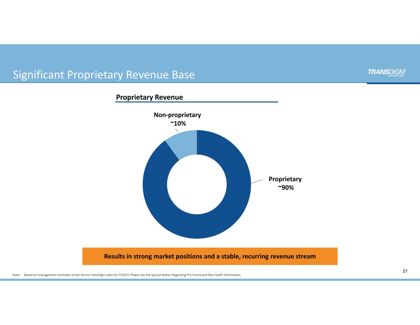 Note: Based on management estimates of pro forma TransDigm sales for FY2023. Please see the Special Notice Regarding Pro Forma and Non‐GAAP Information. 21 Proprietary ~90% Non‐proprietary ~10% Results in strong market positions and a stable, recurring revenue stream Significant Proprietary Revenue Base Proprietary Revenue
