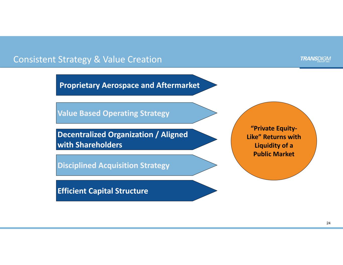 1993 – 2006 2006 – 2010 2011 – 2014  Adel  Aeroproducts  Wiggins  Controlex  Marathon  Adams Rite Aerospace   Christie  Champion  Honeywell Lube Pump  Fuelcom  Norco  Avionic Instruments  Skurka  Fluid Regulators  Eaton Motors  Talley Actuation  Schneller  Harco  AmSafe Passenger  Restraints  AmSafe Commercial  Products  AmSafe Cargo  Restraints & Specialty  Devises  Aero‐Instruments  Beams  Aerosonic  Arkwin   Whippany Actuation   Airborne Systems – North America  Airborne Systems – Europe  Elektro‐Metall Export  Sweeney  Electra‐Motion  CDA InterCorp.  Avtech  ADS/Transicoil  Bruce   CEF  Unison/GE  APC/GE  Acme  Woodward HRT  Dukes  Semco  Hartwell  Electromech  Tyee  TAC (7)  Linread  Valley‐Todeco  AQS  Privately Held NYSE (1) Divested in Q2 and Q3 of FY2011         (2) Divested in Q2 FY2018 (1)  Telair International  AAR Cargo Systems  Nordisk Aviation  Franke Aquarotter  Pexco   PneuDraulics  Breeze‐Eastern  DDC  Young & Franklin  (Tactair)  Schroth (2)  North Hills  Cablecraft Aerospace  Preece  Kirkhill  Extant  Skandia M cKechnie Am Safe Telair (1) (1) 2019 – 20202015 – 2018  Advanced Input  Systems(3)  Armtec  Auxitrol Weston  Avista (5)  CMC Electronics  Darchem   Gamesman(3)  Hytek  Korry  Leach International  Leach NA  LRE Medical(3)  Mason  NMC  Palomar  Racal(6)  Scioteq (7)  Souriau Sunbank(4)  TA Aerospace  Treality SVS (7) Esterline TransDigm has acquired 92 businesses since 1993, including 77 since its IPO. Proven Record of Acquisition and Integration 2021 – 2024  Chelton Ltd.  Canyon  AeroConnect  DART Aerospace  Calspan  Corporation  GKN – FPT  Industries  SEI Industries  CPI – Electron  Device Business (5) Divested in Q1 FY2021 (6) Divested in Q2 FY2021 Cobham  Aero Connectivity 22(3)       Divested in Q4 FY 2019 (4)       Divested in Q1 FY 2020 (7)        Divested in Q3 FY2021