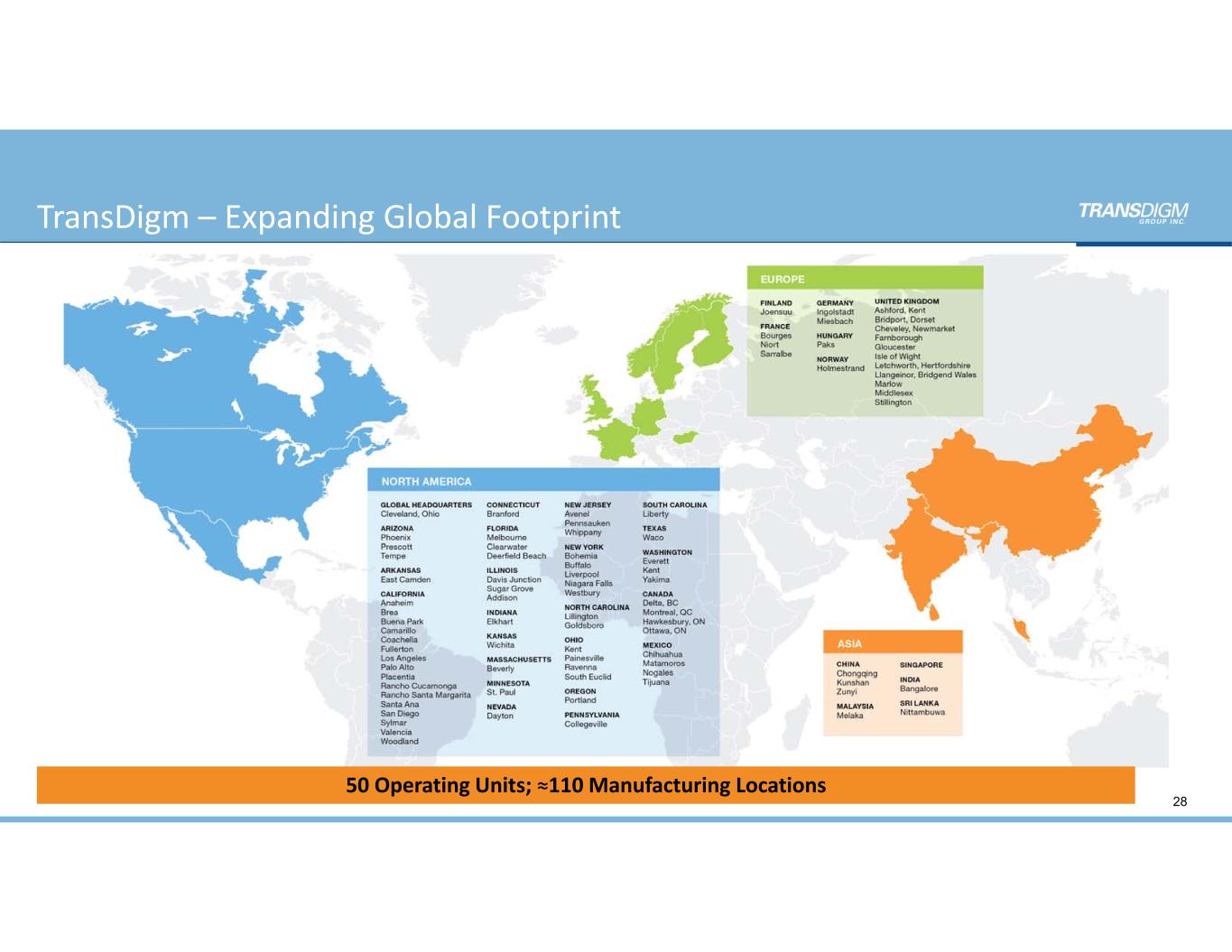 TransDigm – Expanding Global Footprint 28 50 Operating Units; ≈110 Manufacturing Locations