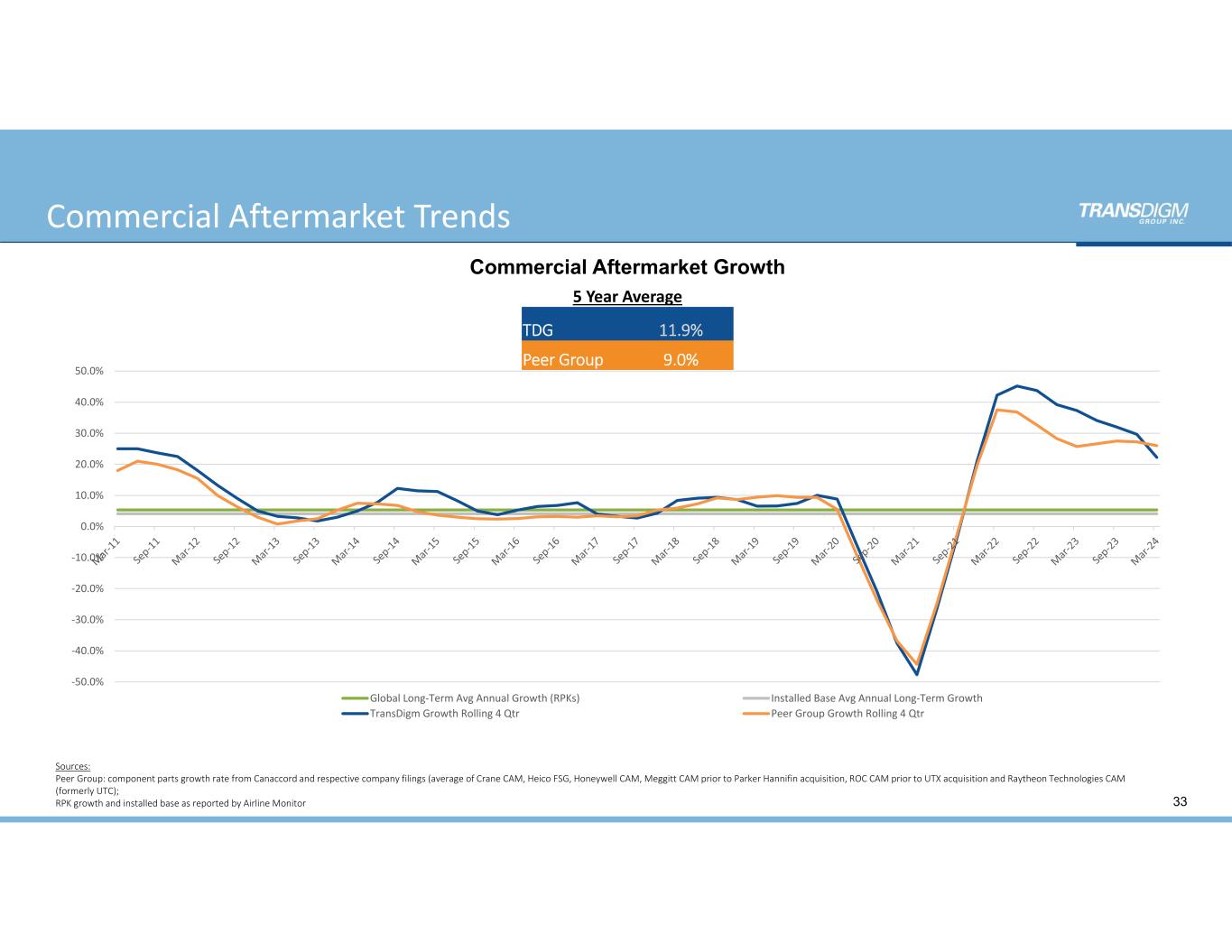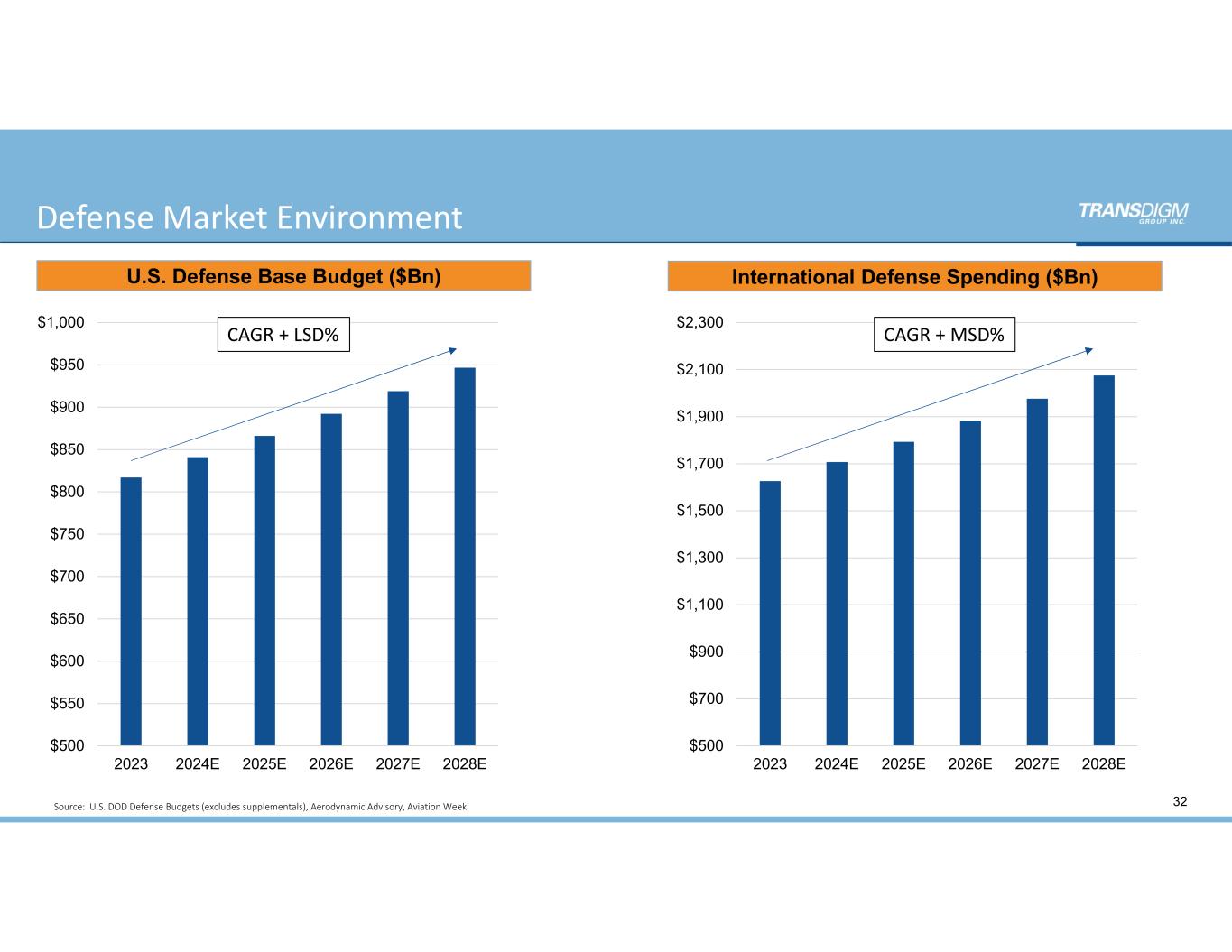 Defense Market Environment 32 $500 $550 $600 $650 $700 $750 $800 $850 $900 $950 $1,000 2023 2024E 2025E 2026E 2027E 2028E U.S. Defense Base Budget ($Bn) CAGR + LSD% Source:  U.S. DOD Defense Budgets (excludes supplementals), Aerodynamic Advisory, Aviation Week $500 $700 $900 $1,100 $1,300 $1,500 $1,700 $1,900 $2,100 $2,300 2023 2024E 2025E 2026E 2027E 2028E International Defense Spending ($Bn) CAGR + MSD%