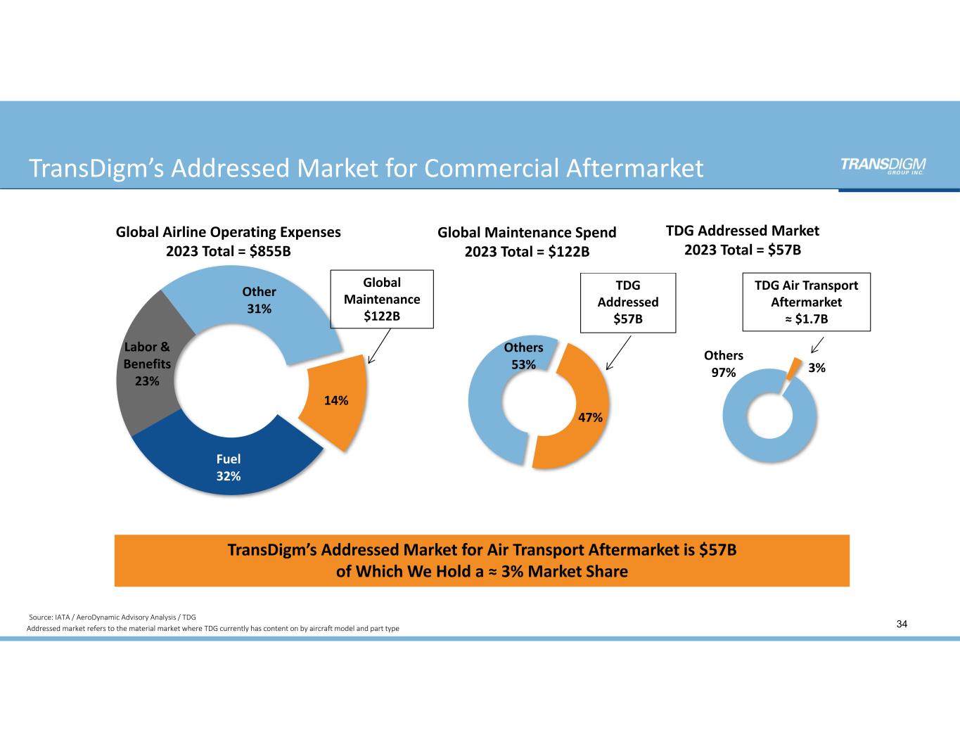 ‐50.0% ‐40.0% ‐30.0% ‐20.0% ‐10.0% 0.0% 10.0% 20.0% 30.0% 40.0% 50.0% Global Long‐Term Avg Annual Growth (RPKs) Installed Base Avg Annual Long‐Term Growth TransDigm Growth Rolling 4 Qtr Peer Group Growth Rolling 4 Qtr Commercial Aftermarket Trends 5 Year Average TDG  11.9% Peer Group 9.0% Commercial Aftermarket Growth 33 Sources: Peer Group: component parts growth rate from Canaccord and respective company filings (average of Crane CAM, Heico FSG, Honeywell CAM, Meggitt CAM prior to Parker Hannifin acquisition, ROC CAM prior to UTX acquisition and Raytheon Technologies CAM  (formerly UTC);  RPK growth and installed base as reported by Airline Monitor