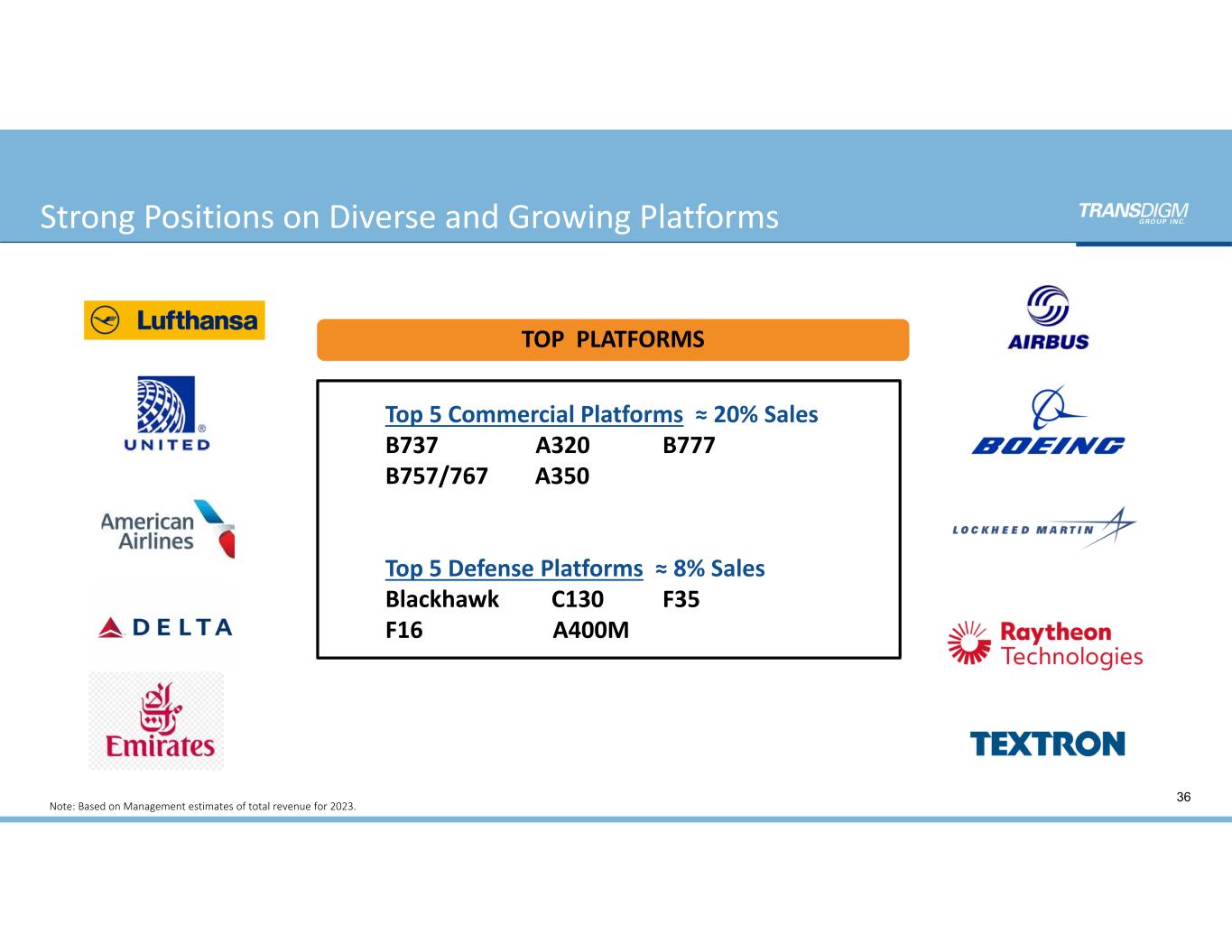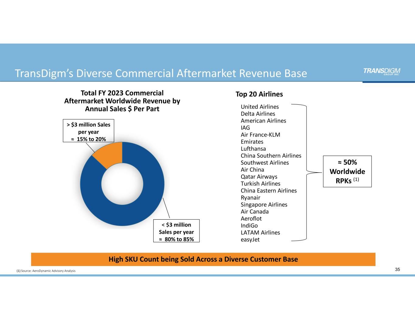 < $3 million  Sales per year  ≈  80% to 85% TransDigm’s Diverse Commercial Aftermarket Revenue Base  Total FY 2023 Commercial  Aftermarket Worldwide Revenue by  Annual Sales $ Per Part United Airlines Delta Airlines American Airlines IAG Air France‐KLM Emirates Lufthansa China Southern Airlines Southwest Airlines Air China Qatar Airways Turkish Airlines China Eastern Airlines Ryanair Singapore Airlines Air Canada Aeroflot IndiGo LATAM Airlines easyJet ≈ 50%  Worldwide  RPKs (1) Top 20 Airlines > $3 million Sales  per year  ≈  15% to 20% High SKU Count being Sold Across a Diverse Customer Base 35(1) Source: AeroDynamic Advisory Analysis