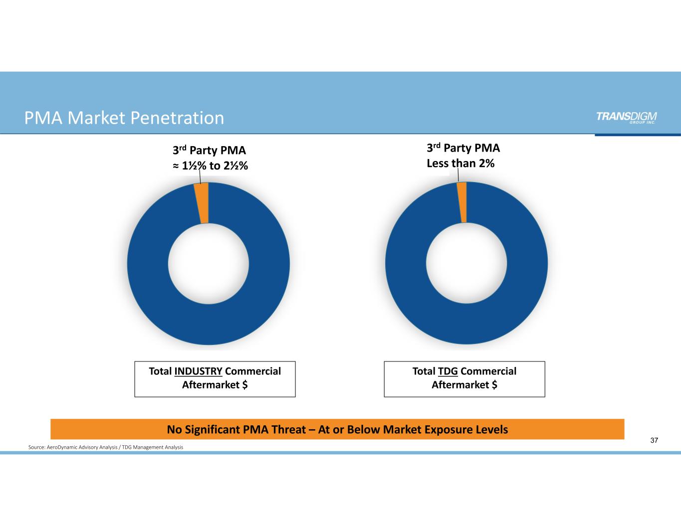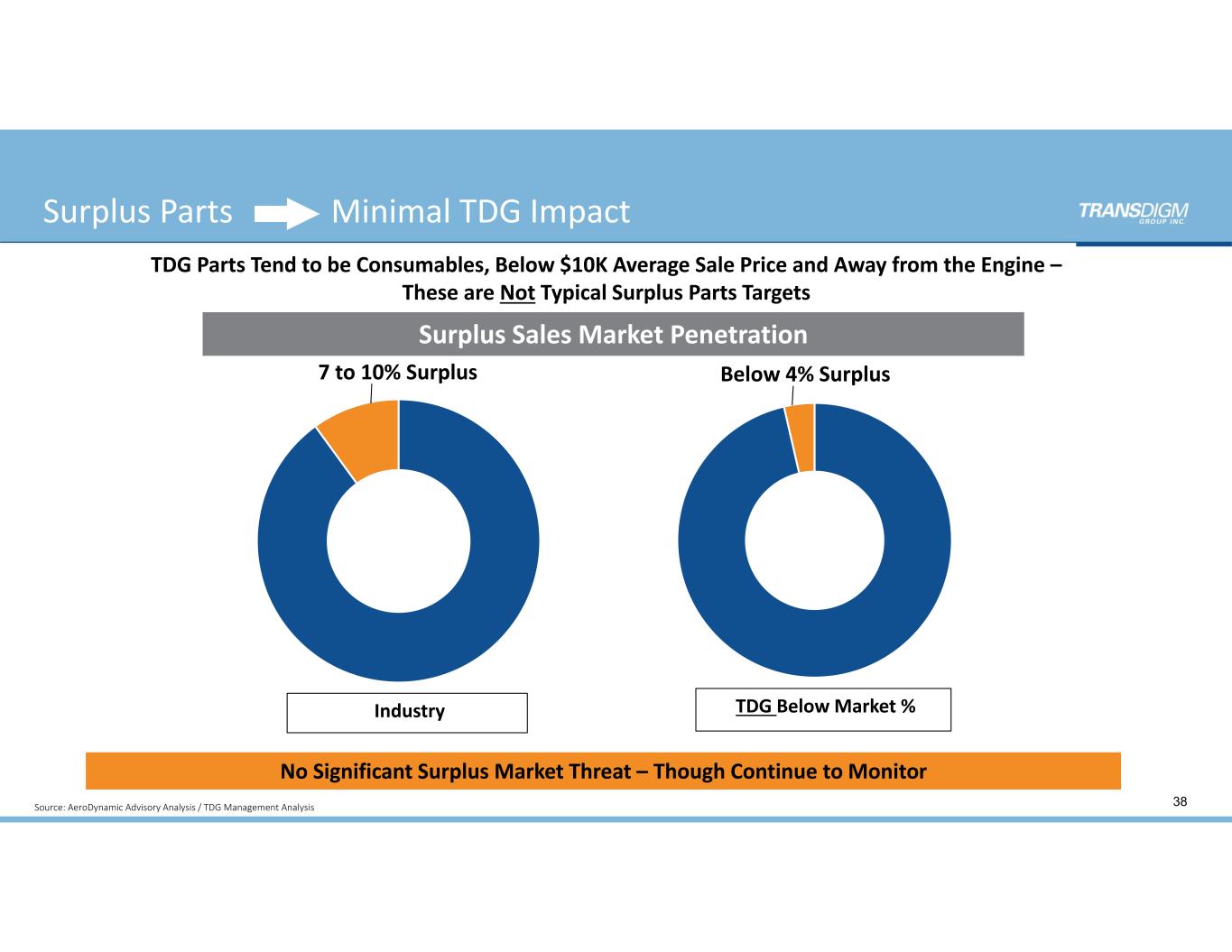No Significant PMA Threat – At or Below Market Exposure Levels  PMA Market Penetration 3rd Party PMA ≈ 1½% to 2½% 3rd Party PMA Less than 2% Total INDUSTRY Commercial  Aftermarket $ 37 Source: AeroDynamic Advisory Analysis / TDG Management Analysis Total TDG Commercial  Aftermarket $
