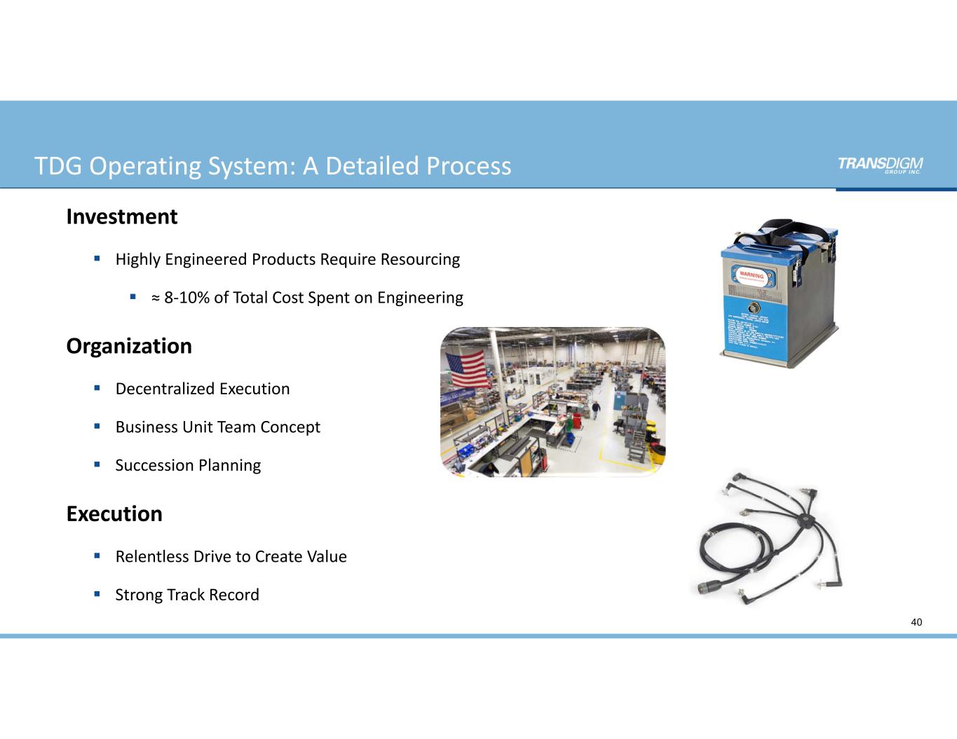 TDG Operating System: A Detailed Process Investment  Highly Engineered Products Require Resourcing  ≈ 8‐10% of Total Cost Spent on Engineering Organization  Decentralized Execution  Business Unit Team Concept   Succession Planning Execution  Relentless Drive to Create Value  Strong Track Record 40