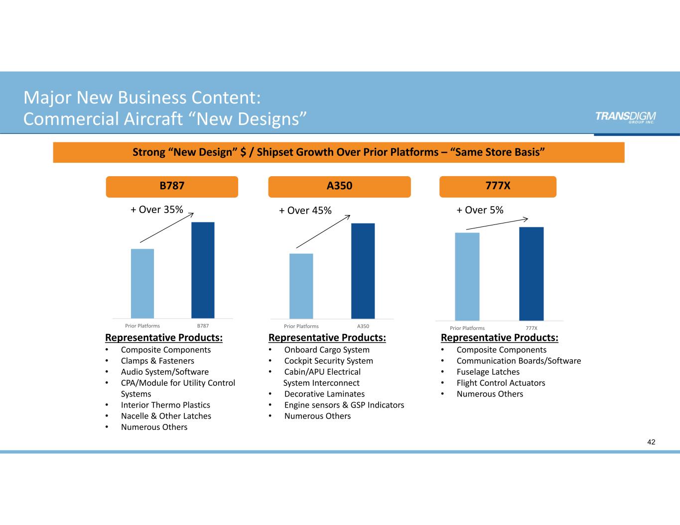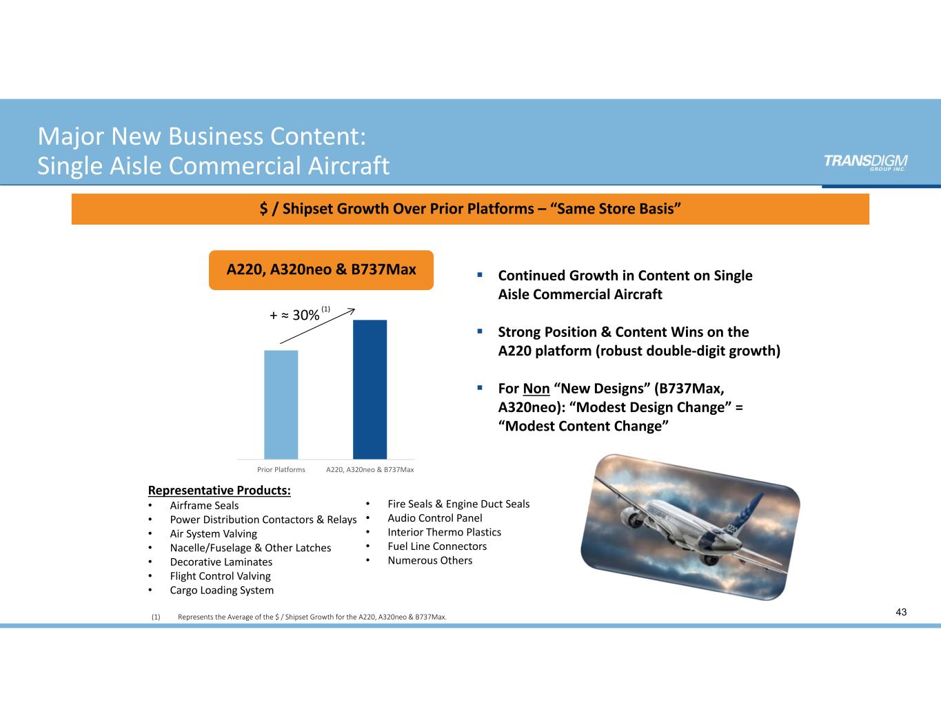 Prior Platforms 777XPrior Platforms A350Prior Platforms B787 Major New Business Content: Commercial Aircraft “New Designs” 42 B787 A350 777X Strong “New Design” $ / Shipset Growth Over Prior Platforms – “Same Store Basis” Representative Products: • Composite Components • Clamps & Fasteners • Audio System/Software • CPA/Module for Utility Control  Systems • Interior Thermo Plastics • Nacelle & Other Latches • Numerous Others Representative Products: • Onboard Cargo System • Cockpit Security System • Cabin/APU Electrical     System Interconnect • Decorative Laminates • Engine sensors & GSP Indicators • Numerous Others Representative Products: • Composite Components • Communication Boards/Software • Fuselage Latches • Flight Control Actuators • Numerous Others + Over 35% + Over 45% + Over 5% 42