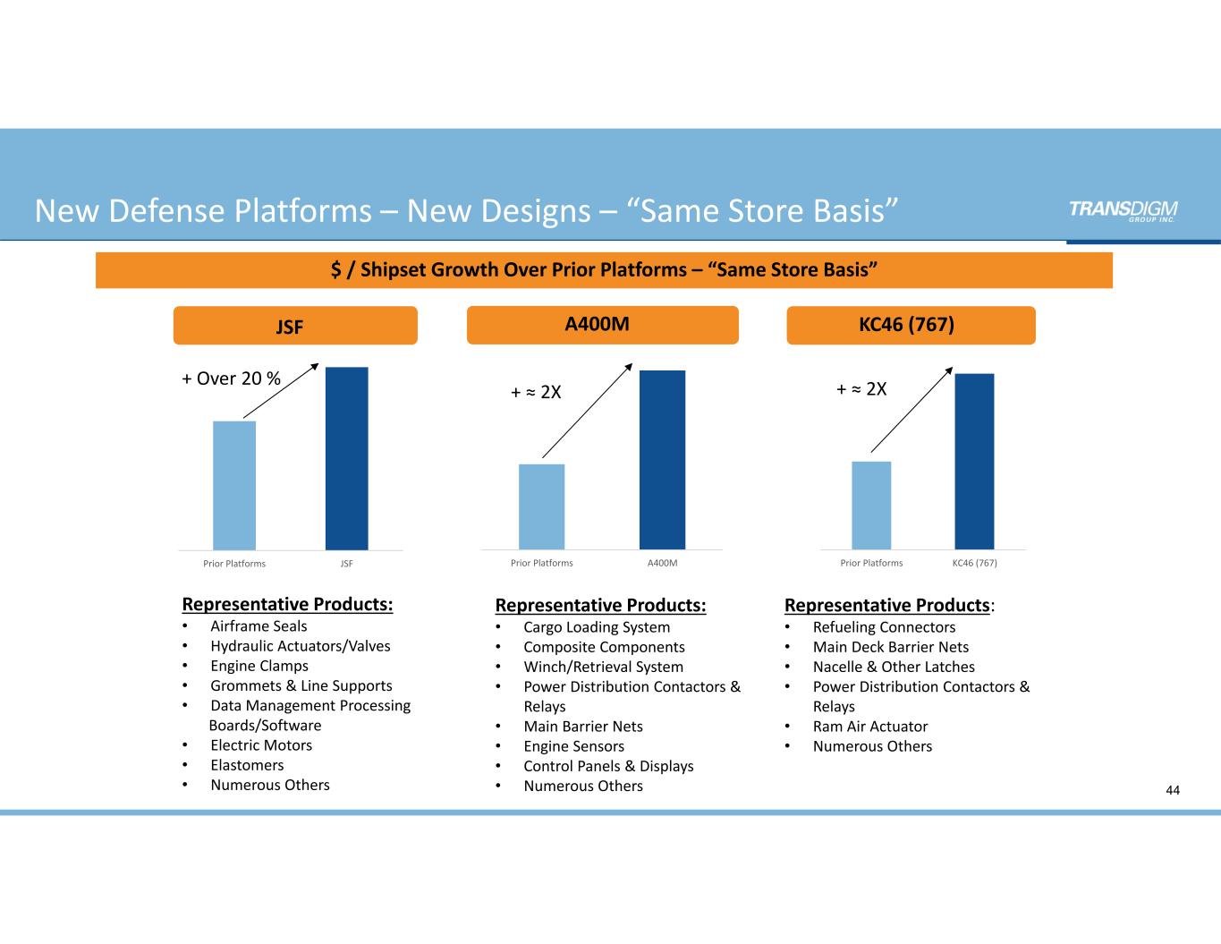 Prior Platforms A220, A320neo & B737Max Major New Business Content: Single Aisle Commercial Aircraft 43 $ / Shipset Growth Over Prior Platforms – “Same Store Basis” Representative Products: • Airframe Seals • Power Distribution Contactors & Relays • Air System Valving • Nacelle/Fuselage & Other Latches • Decorative Laminates • Flight Control Valving • Cargo Loading System + ≈ 30%  Continued Growth in Content on Single  Aisle Commercial Aircraft  Strong Position & Content Wins on the  A220 platform (robust double‐digit growth)  For Non “New Designs” (B737Max,  A320neo): “Modest Design Change” =  “Modest Content Change” • Fire Seals & Engine Duct Seals • Audio Control Panel • Interior Thermo Plastics • Fuel Line Connectors • Numerous Others (1) (1) Represents the Average of the $ / Shipset Growth for the A220, A320neo & B737Max. A220, A320neo & B737Max 43