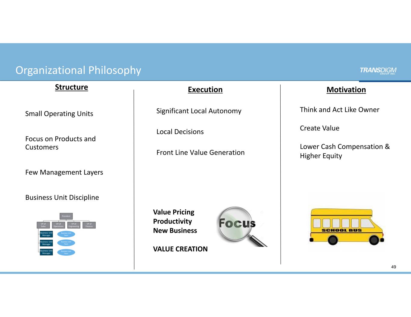 Structure Small Operating Units Focus on Products and  Customers Few Management Layers Business Unit Discipline Execution Significant Local Autonomy Local Decisions Front Line Value Generation Motivation Think and Act Like Owner Create Value Lower Cash Compensation &  Higher Equity Value Pricing Productivity New Business VALUE CREATION 49 Organizational Philosophy