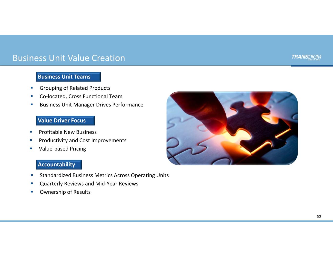  Grouping of Related Products  Co‐located, Cross Functional Team  Business Unit Manager Drives Performance Business Unit Teams  Profitable New Business  Productivity and Cost Improvements  Value‐based Pricing Value Driver Focus  Standardized Business Metrics Across Operating Units   Quarterly Reviews and Mid‐Year Reviews  Ownership of Results Accountability 53 Business Unit Value Creation
