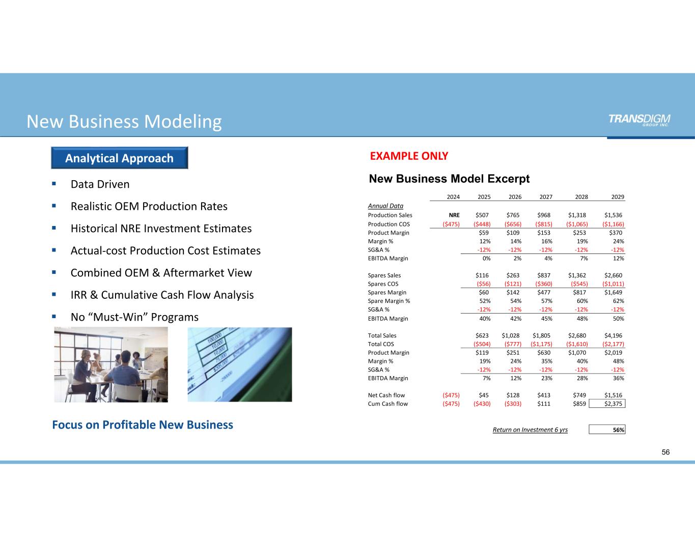 2024 2025 2026 2027 2028 2029 Annual Data Production Sales NRE $507 $765 $968 $1,318 $1,536 Production COS ($475) ($448) ($656) ($815) ($1,065) ($1,166) Product Margin $59 $109 $153 $253 $370 Margin % 12% 14% 16% 19% 24% SG&A % ‐12% ‐12% ‐12% ‐12% ‐12% EBITDA Margin 0% 2% 4% 7% 12% Spares Sales $116 $263 $837 $1,362 $2,660 Spares COS ($56) ($121) ($360) ($545) ($1,011) Spares Margin $60 $142 $477 $817 $1,649 Spare Margin % 52% 54% 57% 60% 62% SG&A % ‐12% ‐12% ‐12% ‐12% ‐12% EBITDA Margin 40% 42% 45% 48% 50% Total Sales $623 $1,028 $1,805 $2,680 $4,196 Total COS ($504) ($777) ($1,175) ($1,610) ($2,177) Product Margin $119 $251 $630 $1,070 $2,019 Margin % 19% 24% 35% 40% 48% SG&A % ‐12% ‐12% ‐12% ‐12% ‐12% EBITDA Margin 7% 12% 23% 28% 36% Net Cash flow ($475) $45 $128 $413 $749 $1,516 Cum Cash flow ($475) ($430) ($303) $111 $859 $2,375 Return on Investment 6 yrs 56%  Data Driven  Realistic OEM Production Rates  Historical NRE Investment Estimates  Actual‐cost Production Cost Estimates  Combined OEM & Aftermarket View  IRR & Cumulative Cash Flow Analysis  No “Must‐Win” Programs Focus on Profitable New Business New Business Model Excerpt Analytical Approach EXAMPLE ONLY 56 New Business Modeling