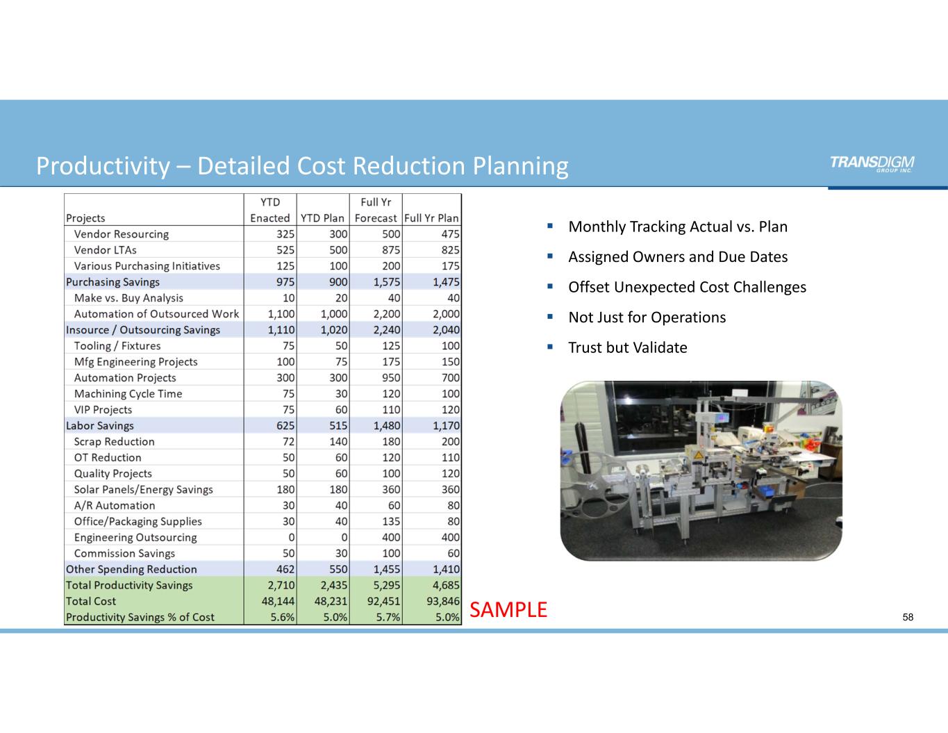  Monthly Tracking Actual vs. Plan  Assigned Owners and Due Dates   Offset Unexpected Cost Challenges  Not Just for Operations  Trust but Validate Note: For Illustration Only 58SAMPLE Productivity – Detailed Cost Reduction Planning