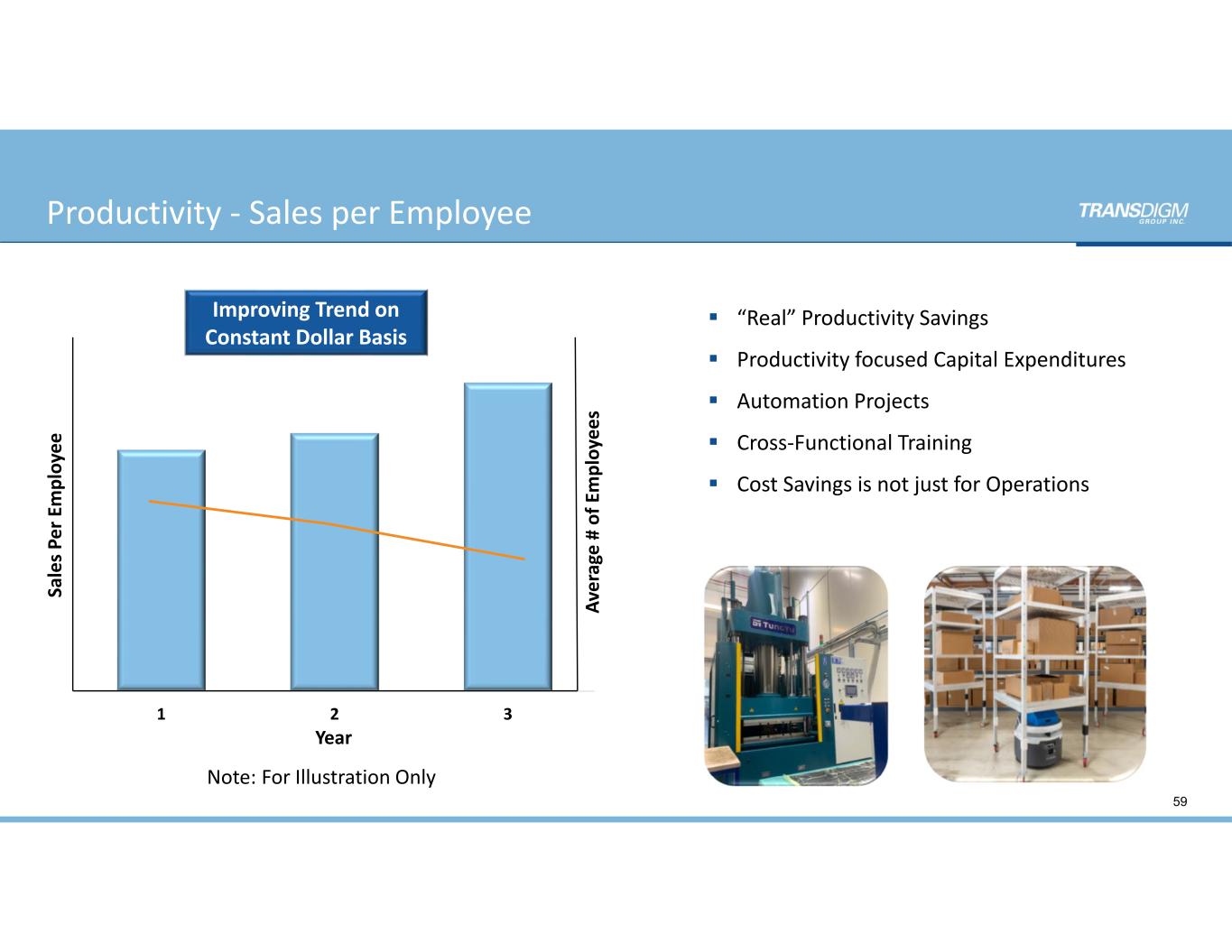 1 2 3 Note: For Illustration Only Sa le s P er  E m pl oy ee Av er ag e #  of  E m pl oy ee s Improving Trend on  Constant Dollar Basis  “Real” Productivity Savings  Productivity focused Capital Expenditures  Automation Projects  Cross‐Functional Training  Cost Savings is not just for Operations 59 Year Productivity ‐ Sales per Employee