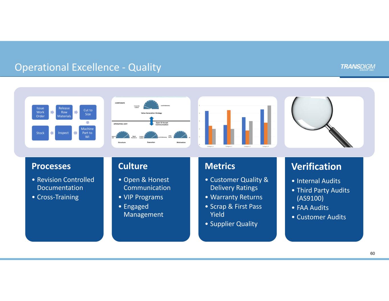 60 Processes • Revision Controlled  Documentation • Cross‐Training Culture • Open & Honest  Communication • VIP Programs • Engaged  Management Metrics • Customer Quality &  Delivery Ratings • Warranty Returns • Scrap & First Pass  Yield • Supplier Quality Verification • Internal Audits • Third Party Audits  (AS9100) • FAA Audits • Customer Audits Operational Excellence ‐ Quality