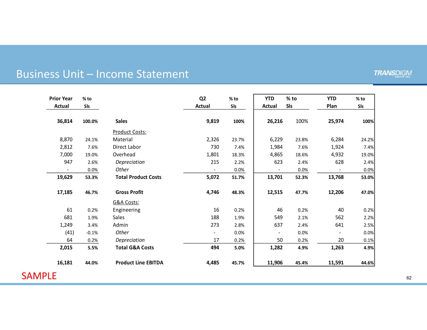 Prior Year % to Q2 % to YTD % to YTD % to  Actual Sls Actual Sls Actual Sls Plan Sls 36,814       100.0%   Sales 9,819                100% 26,216         100% 25,974        100% Product Costs: 8,870         24.1% Material 2,326                23.7% 6,229           23.8% 6,284          24.2% 2,812         7.6% Direct Labor 730                   7.4% 1,984           7.6% 1,924          7.4% 7,000         19.0% Overhead 1,801                18.3% 4,865           18.6% 4,932          19.0% 947            2.6%   Depreciation 215                   2.2% 623              2.4% 628             2.4%               ‐    0.0%   Other                     ‐    0.0%                  ‐    0.0%               ‐    0.0% 19,629       53.3%   Total Product Costs 5,072                51.7% 13,701         52.3% 13,768        53.0% 17,185       46.7%   Gross Profit 4,746                48.3% 12,515         47.7% 12,206        47.0% G&A Costs: 61              0.2% Engineering 16                     0.2% 46                0.2% 40               0.2% 681            1.9% Sales 188                   1.9% 549              2.1% 562             2.2% 1,249         3.4% Admin 273                   2.8% 637              2.4% 641             2.5% (41)             ‐0.1%   Other                     ‐    0.0%                  ‐    0.0%               ‐    0.0% 64              0.2%   Depreciation 17                     0.2% 50                0.2% 20               0.1% 2,015         5.5%   Total G&A Costs 494                   5.0% 1,282           4.9% 1,263          4.9% 16,181       44.0%   Product Line EBITDA 4,485                45.7% 11,906         45.4% 11,591        44.6% 62SAMPLE Business Unit – Income Statement