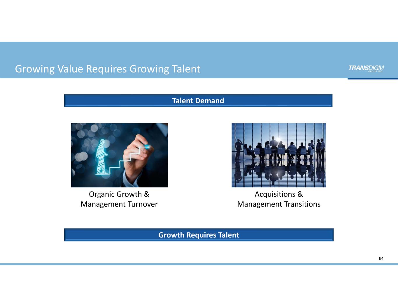 Organic Growth &  Management Turnover Talent Demand Growth Requires Talent Acquisitions &  Management Transitions 64 Growing Value Requires Growing Talent