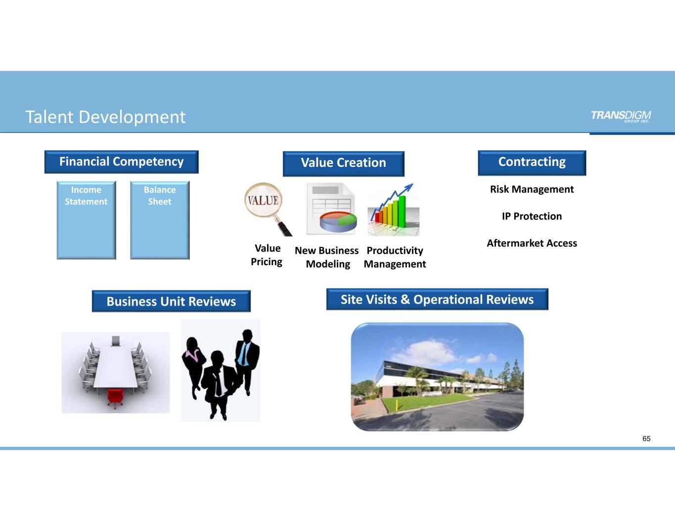 Income  Statement Balance  Sheet Financial Competency Value Pricing New Business  Modeling Productivity Management Value Creation Risk Management IP Protection Aftermarket Access Contracting Business Unit Reviews Site Visits & Operational Reviews 65 Talent Development