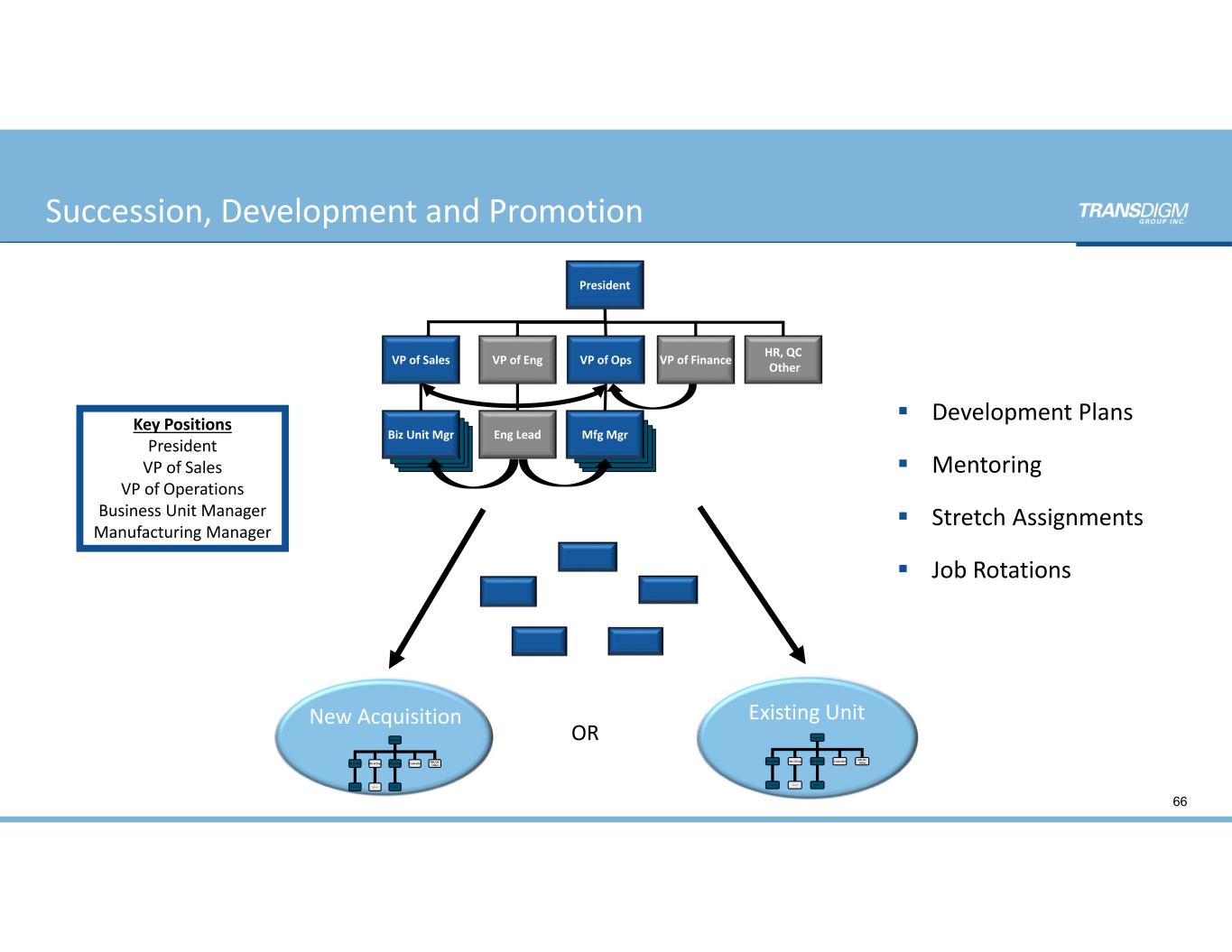 OR Key Positions President VP of Sales VP of Operations Business Unit Manager Manufacturing Manager New Acquisition President Dir of S&M Dir of Eng Dir of Mfg. Controller Prod Line Mgr Mfg MgrEng Lead HR, QC Other Existing Unit President Dir of S&M Dir of Eng Dir of Mfg. Controller Prod Line Mgr Mfg MgrEng Lead HR, QC Other President VP of Sales VP of Eng VP of Ops VP of Finance Biz Unit Mgr Mfg MgrEng Lead HR, QC Other  Development Plans  Mentoring  Stretch Assignments  Job Rotations 66 Succession, Development and Promotion