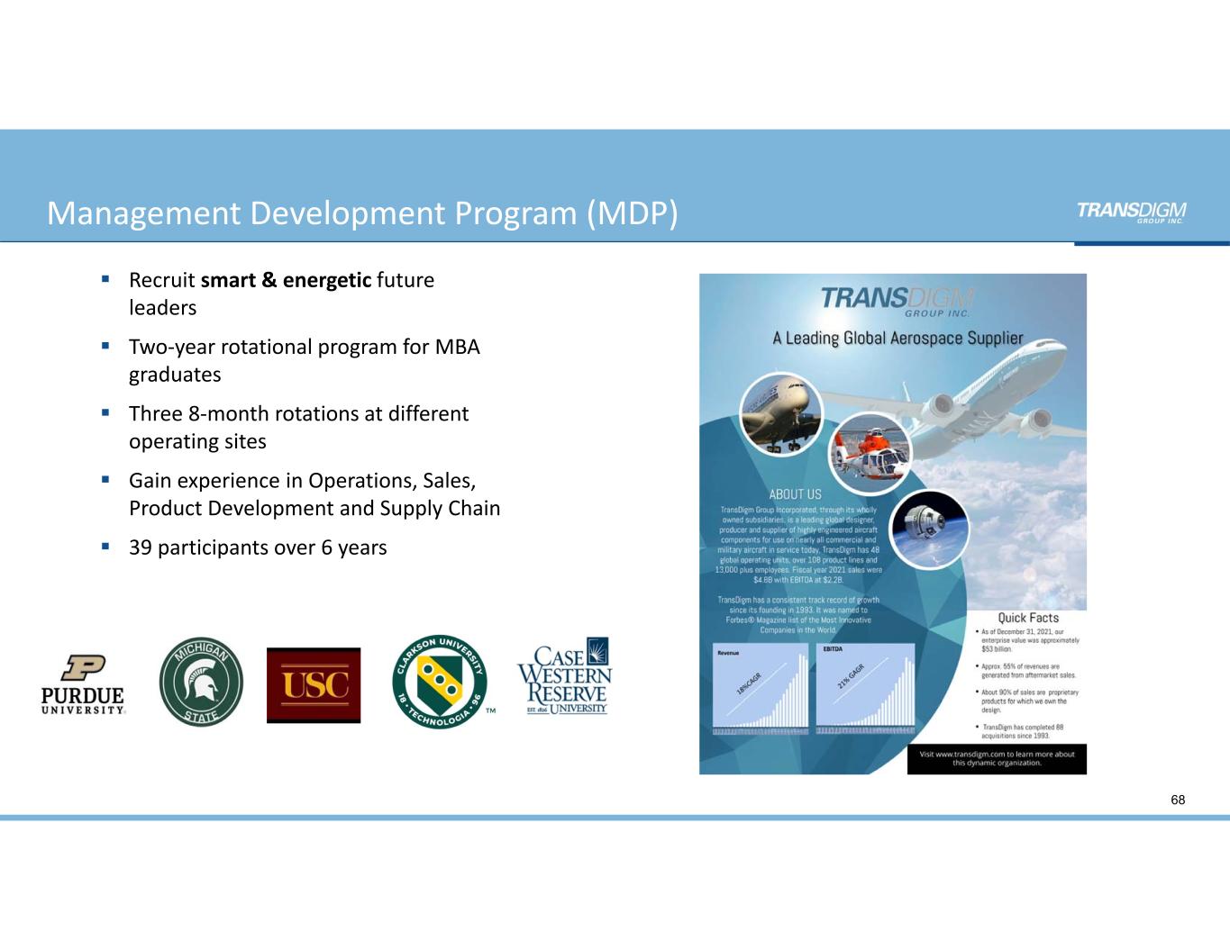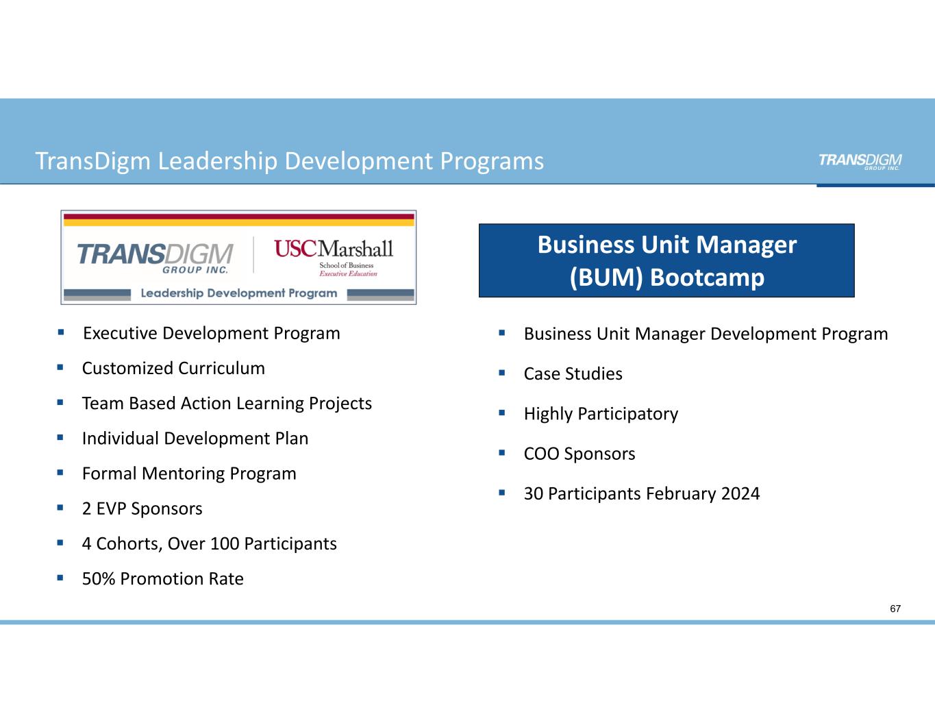  Executive Development Program  Customized Curriculum   Team Based Action Learning Projects  Individual Development Plan  Formal Mentoring Program  2 EVP Sponsors  4 Cohorts, Over 100 Participants  50% Promotion Rate  Business Unit Manager Development Program  Case Studies  Highly Participatory  COO Sponsors  30 Participants February 2024 Business Unit Manager  (BUM) Bootcamp 67 TransDigm Leadership Development Programs