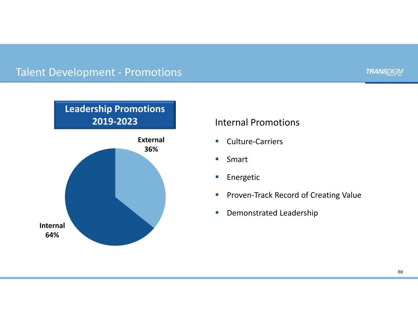 Leadership Promotions  2019‐2023 Internal 64% External 36% Internal Promotions  Culture‐Carriers  Smart  Energetic  Proven‐Track Record of Creating Value  Demonstrated Leadership 69 Talent Development ‐ Promotions