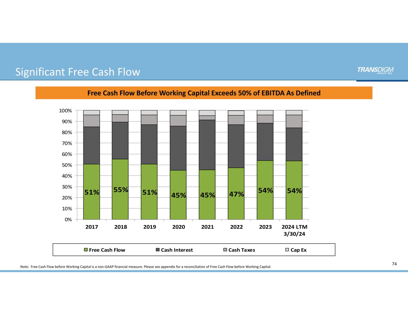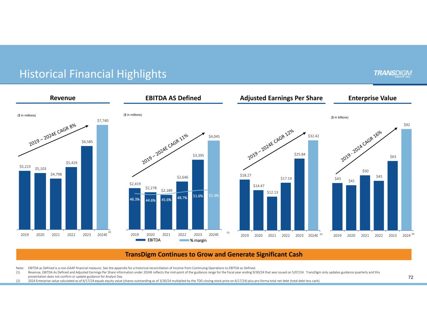 TransDigm Continues to Grow and Generate Significant Cash  Enterprise ValueAdjusted Earnings Per ShareEBITDA AS DefinedRevenue $5,223   $5,103   $4,798   $5,429   $6,585   $7,740   2019 2020 2021 2022 2023 2024E ($ in millions) $2,419   $2,278   $2,189   $2,646   $3,395   $4,045   46.3% 44.6% 45.6% 48.7% 51.6% 52.3%  $1,000  $1,500  $2,000  $2,500  $3,000  $3,500  $4,000  $4,500 2019 2020 2021 2022 2023 2024E ($ in millions) $43   $41   $50   $45   $63   $92   2019 2020 2021 2022 2023 2024 ($ in billions) $18.27  $14.47  $12.13  $17.14  $25.84  $32.42  2019 2020 2021 2022 2023 2024E EBITDA % margin Note:   EBITDA as Defined is a non‐GAAP financial measure. See the appendix for a historical reconciliation of Income from Continuing Operations to EBITDA as Defined. (1) Revenue, EBITDA As Defined and Adjusted Earnings Per Share information under 2024E reflects the mid‐point of the guidance range for the fiscal year ending 9/30/24 that was issued on 5/07/24.  TransDigm only updates guidance quarterly and this  presentation does not confirm or update guidance for Analyst Day. (2)  2024 Enterprise value calculated as of 6/17/24 equals equity value (shares outstanding as of 3/30/24 multiplied by the TDG closing stock price on 6/17/24) plus pro forma total net debt (total debt less cash). (2)(1) Historical Financial Highlights 72 (1) (1)