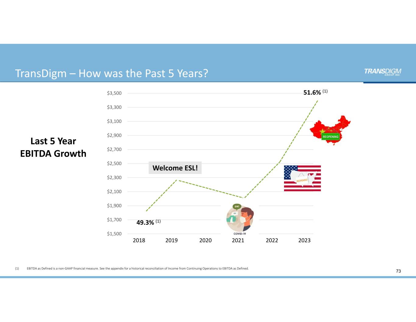 TransDigm – How was the Past 5 Years?  $1,500  $1,700  $1,900  $2,100  $2,300  $2,500  $2,700  $2,900  $3,100  $3,300  $3,500 1 2 3 4 5 6 49.3% (1) Last 5 Year  EBITDA Growth Welcome ESL! 2018 2019 2020 2021 2022 2023 73 51.6% (1) (1) EBITDA as Defined is a non‐GAAP financial measure. See the appendix for a historical reconciliation of Income from Continuing Operations to EBITDA as Defined.