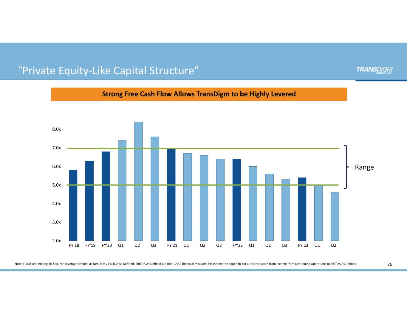 2.0x  3.0x  4.0x  5.0x  6.0x  7.0x  8.0x FY'18 FY'19 FY'20 Q1 Q2 Q3 FY'21 Q1 Q2 Q3 FY'22 Q1 Q2 Q3 FY'23 Q1 Q2 Strong Free Cash Flow Allows TransDigm to be Highly Levered Note: Fiscal year ending 30‐Sep. Net leverage defined as Net Debt / EBITDA As Defined. EBITDA As Defined is a non‐GAAP financial measure. Please see the appendix for a reconciliation from Income from Continuing Operations to EBITDA As Defined.    “Private Equity‐Like Capital Structure" 75 Range