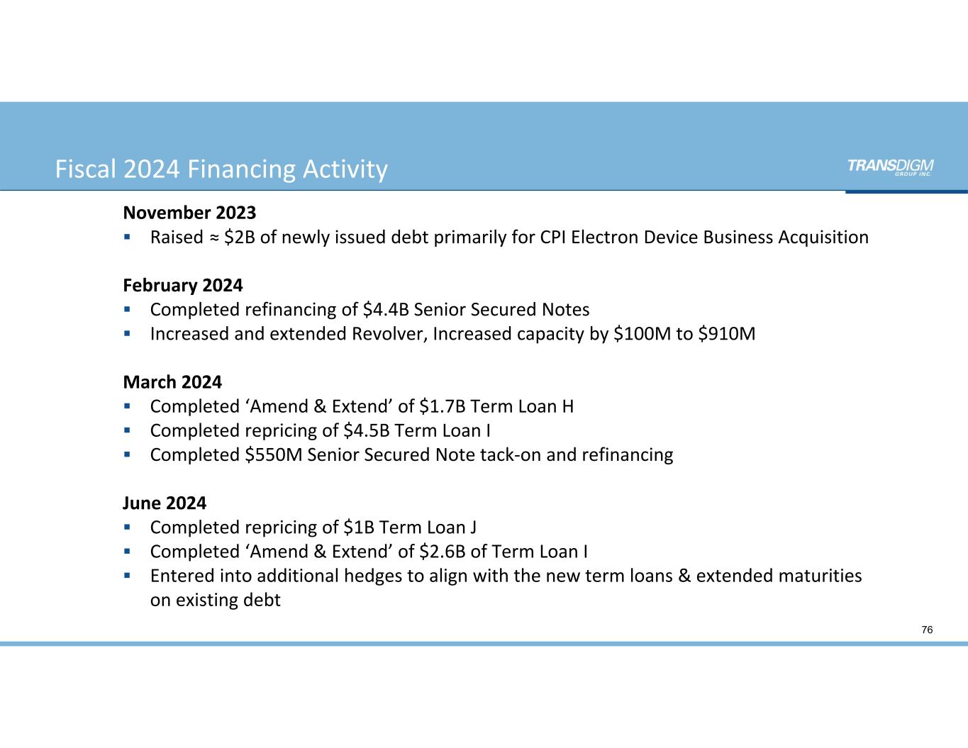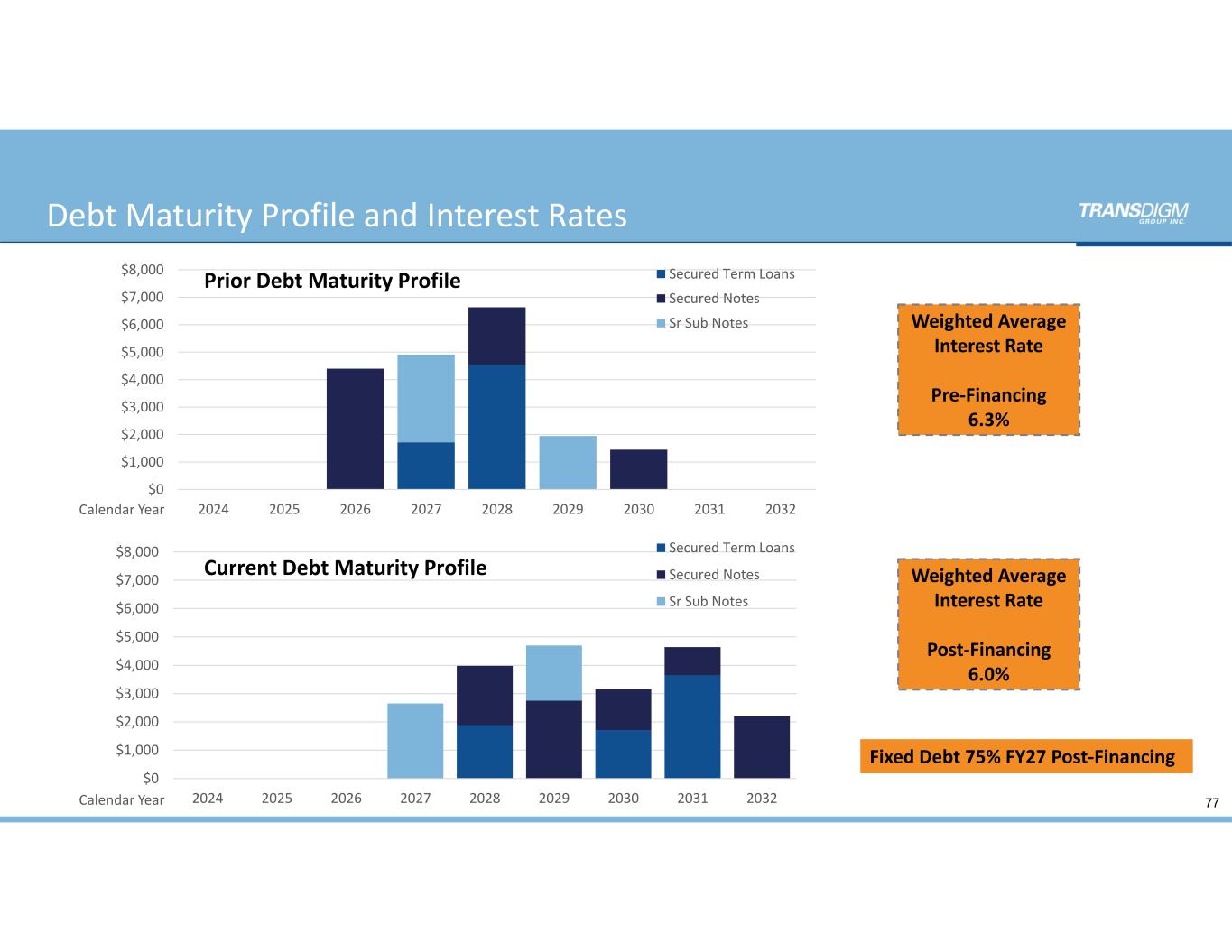 Fiscal 2024 Financing Activity November 2023  Raised ≈ $2B of newly issued debt primarily for CPI Electron Device Business Acquisition February 2024  Completed refinancing of $4.4B Senior Secured Notes  Increased and extended Revolver, Increased capacity by $100M to $910M March 2024  Completed ‘Amend & Extend’ of $1.7B Term Loan H  Completed repricing of $4.5B Term Loan I  Completed $550M Senior Secured Note tack‐on and refinancing June 2024  Completed repricing of $1B Term Loan J  Completed ‘Amend & Extend’ of $2.6B of Term Loan I  Entered into additional hedges to align with the new term loans & extended maturities  on existing debt 76