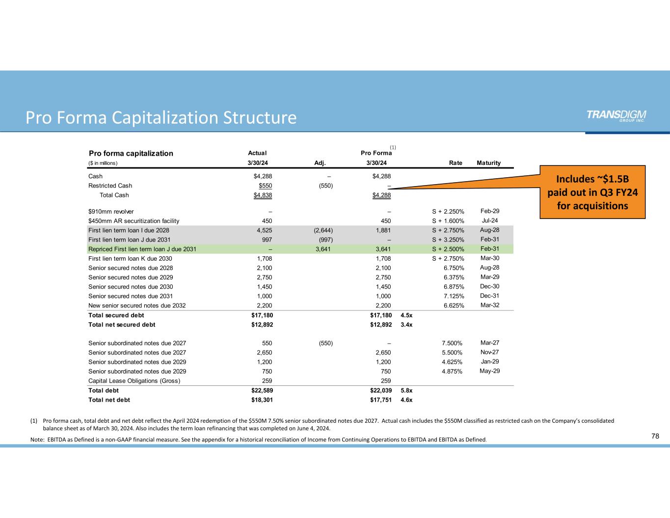 Pro Forma Capitalization Structure 78 (1) (1) Pro forma cash, total debt and net debt reflect the April 2024 redemption of the $550M 7.50% senior subordinated notes due 2027. Actual cash includes the $550M classified as restricted cash on the Company’s consolidated  balance sheet as of March 30, 2024. Also includes the term loan refinancing that was completed on June 4, 2024.  Note:  EBITDA as Defined is a non‐GAAP financial measure. See the appendix for a historical reconciliation of Income from Continuing Operations to EBITDA and EBITDA as Defined. Pro forma capitalization Actual Pro Forma ($ in millions) 3/30/24 Adj. 3/30/24 Rate Maturity Cash $4,288 – $4,288 Restricted Cash $550 (550) – Total Cash $4,838 $4,288 $910mm revolver – – S + 2.250% Feb-29 $450mm AR securitization facility 450 450 S + 1.600% Jul-24 First lien term loan I due 2028 4,525 (2,644) 1,881 S + 2.750% Aug-28 First lien term loan J due 2031 997 (997) – S + 3.250% Feb-31 Repriced First lien term loan J due 2031 – 3,641 3,641 S + 2.500% Feb-31 First lien term loan K due 2030 1,708 1,708 S + 2.750% Mar-30 Senior secured notes due 2028 2,100 2,100 6.750% Aug-28 Senior secured notes due 2029 2,750 2,750 6.375% Mar-29 Senior secured notes due 2030 1,450 1,450 6.875% Dec-30 Senior secured notes due 2031 1,000 1,000 7.125% Dec-31 New senior secured notes due 2032 2,200 2,200 6.625% Mar-32 Total secured debt $17,180 $17,180 4.5x Total net secured debt $12,892 $12,892 3.4x Senior subordinated notes due 2027 550 (550) – 7.500% Mar-27 Senior subordinated notes due 2027 2,650 2,650 5.500% Nov-27 Senior subordinated notes due 2029 1,200 1,200 4.625% Jan-29 Senior subordinated notes due 2029 750 750 4.875% May-29 Capital Lease Obligations (Gross) 259 259 Total debt $22,589 $22,039 5.8x Total net debt $18,301 $17,751 4.6x (1) Includes ~$1.5B   paid out in Q3 FY24  for acquisitions