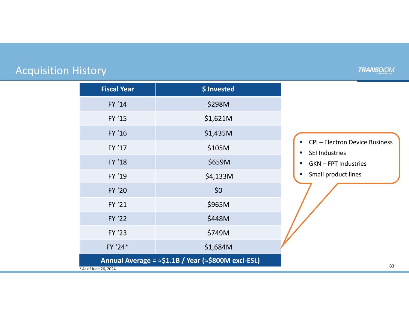 Acquisition History 83 Fiscal Year $ Invested FY ‘14 $298M FY ‘15 $1,621M FY ‘16 $1,435M FY ‘17 $105M FY ‘18 $659M FY ‘19 $4,133M FY ‘20 $0 FY ‘21 $965M FY ‘22 $448M FY ‘23 $749M FY ‘24* $1,684M Annual Average = ≈$1.1B / Year (≈$800M excl‐ESL) * As of June 26, 2024  CPI – Electron Device Business   SEI Industries  GKN – FPT Industries  Small product lines