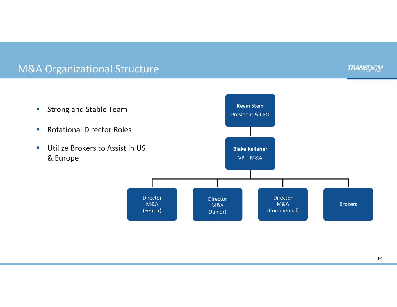M&A Organizational Structure 84 Kevin Stein  President & CEO Blake Kelleher  VP – M&A  Director  M&A  (Senior) Director M&A  (Junior) Director M&A (Commercial) Brokers  Strong and Stable Team  Rotational Director Roles  Utilize Brokers to Assist in US  & Europe