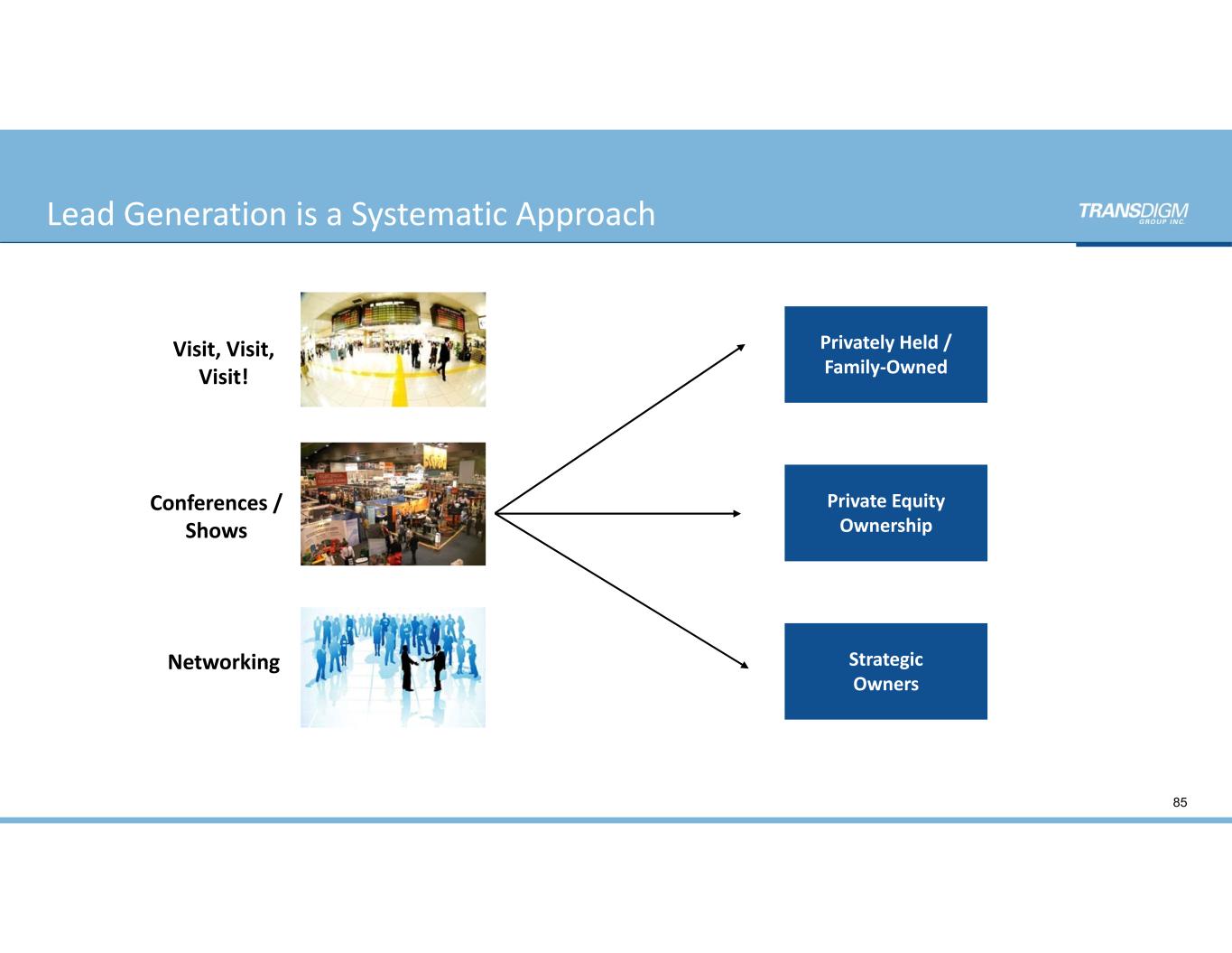 Lead Generation is a Systematic Approach Conferences / Shows Networking Visit, Visit,  Visit! Privately Held /  Family‐Owned Private Equity Ownership 85 Strategic Owners