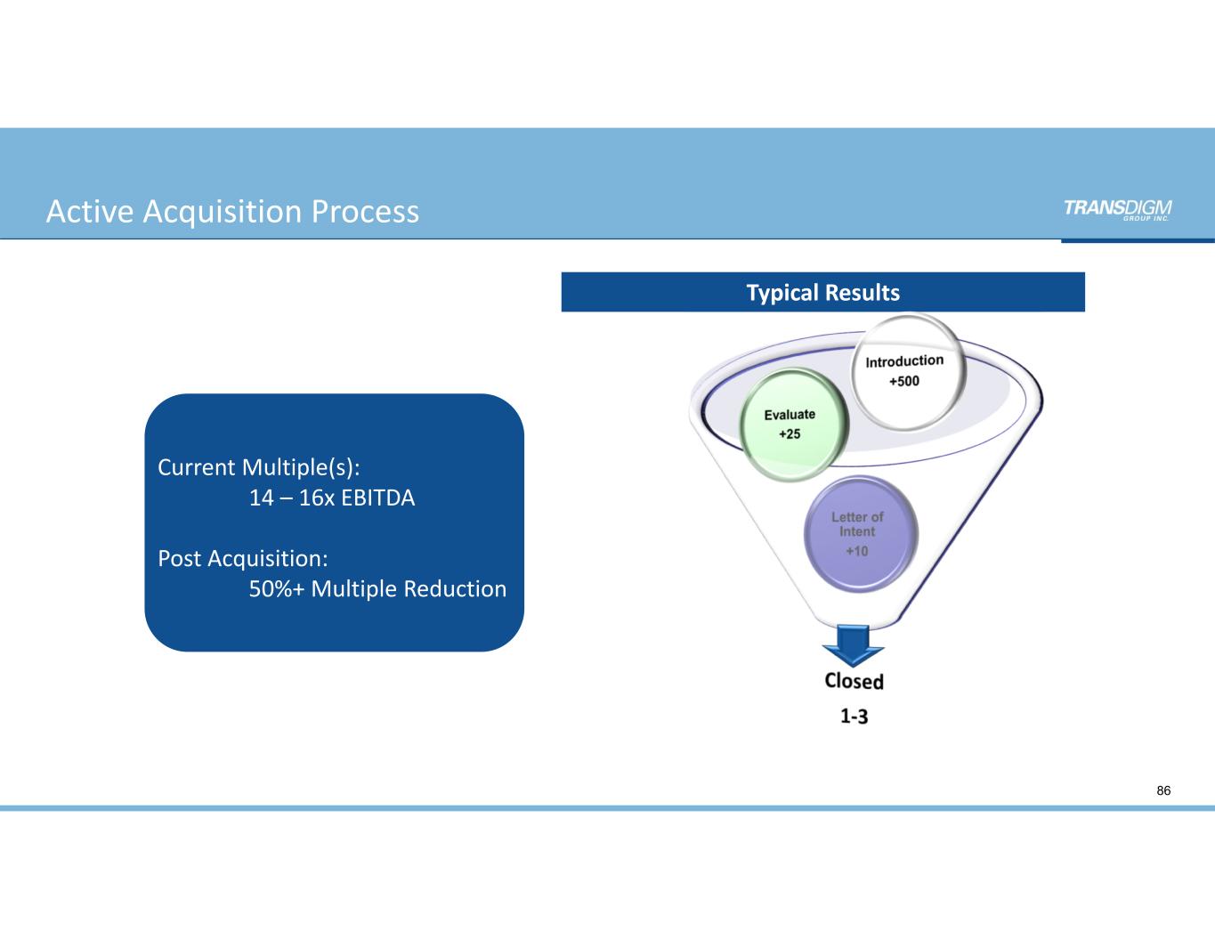 Active Acquisition Process  86 Current Multiple(s): 14 – 16x EBITDA Post Acquisition: 50%+ Multiple Reduction Typical Results