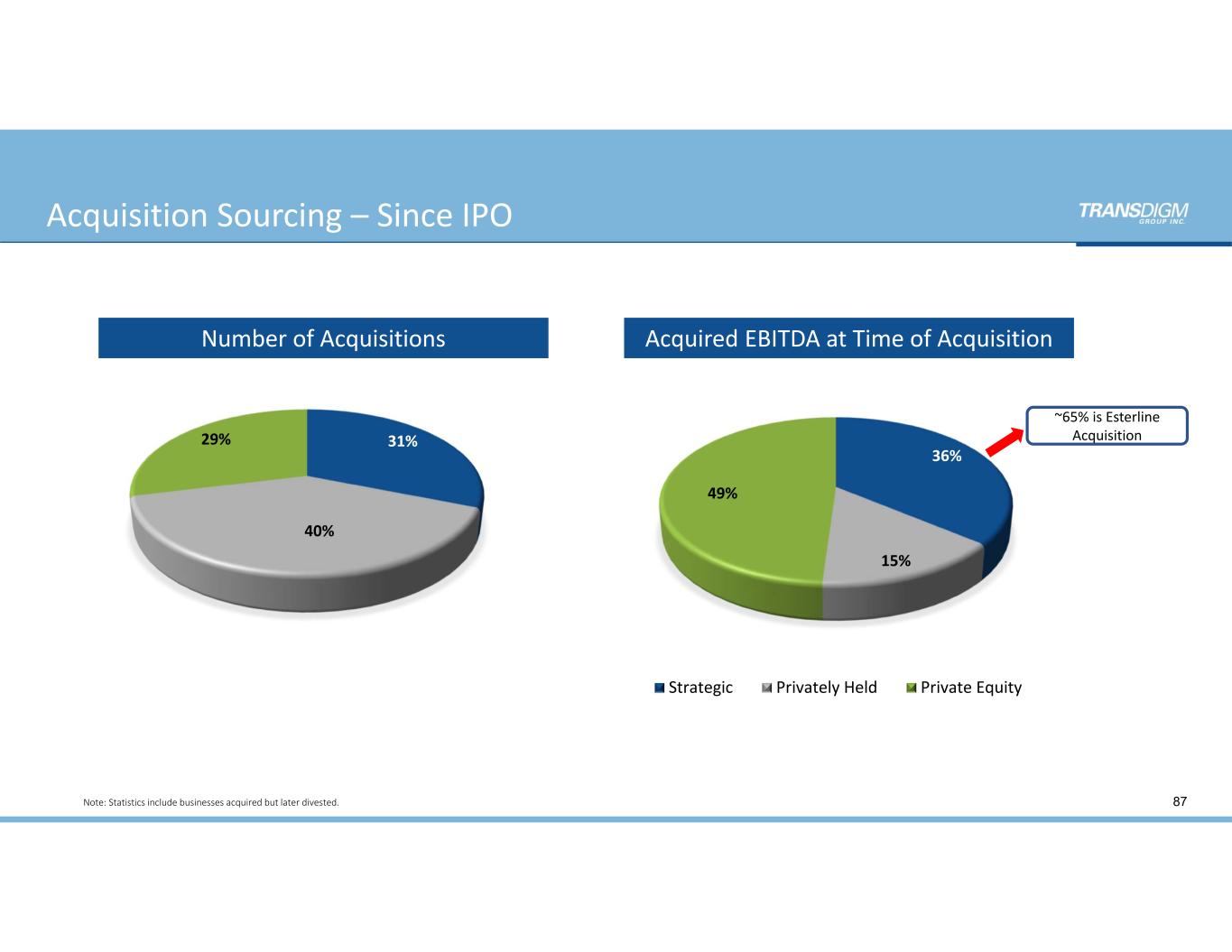 Acquisition Sourcing – Since IPO 87 31% 40% 29% Number of Acquisitions Note: Statistics include businesses acquired but later divested. 36% 15% 49% Strategic Privately Held Private Equity Acquired EBITDA at Time of Acquisition ~65% is Esterline  Acquisition