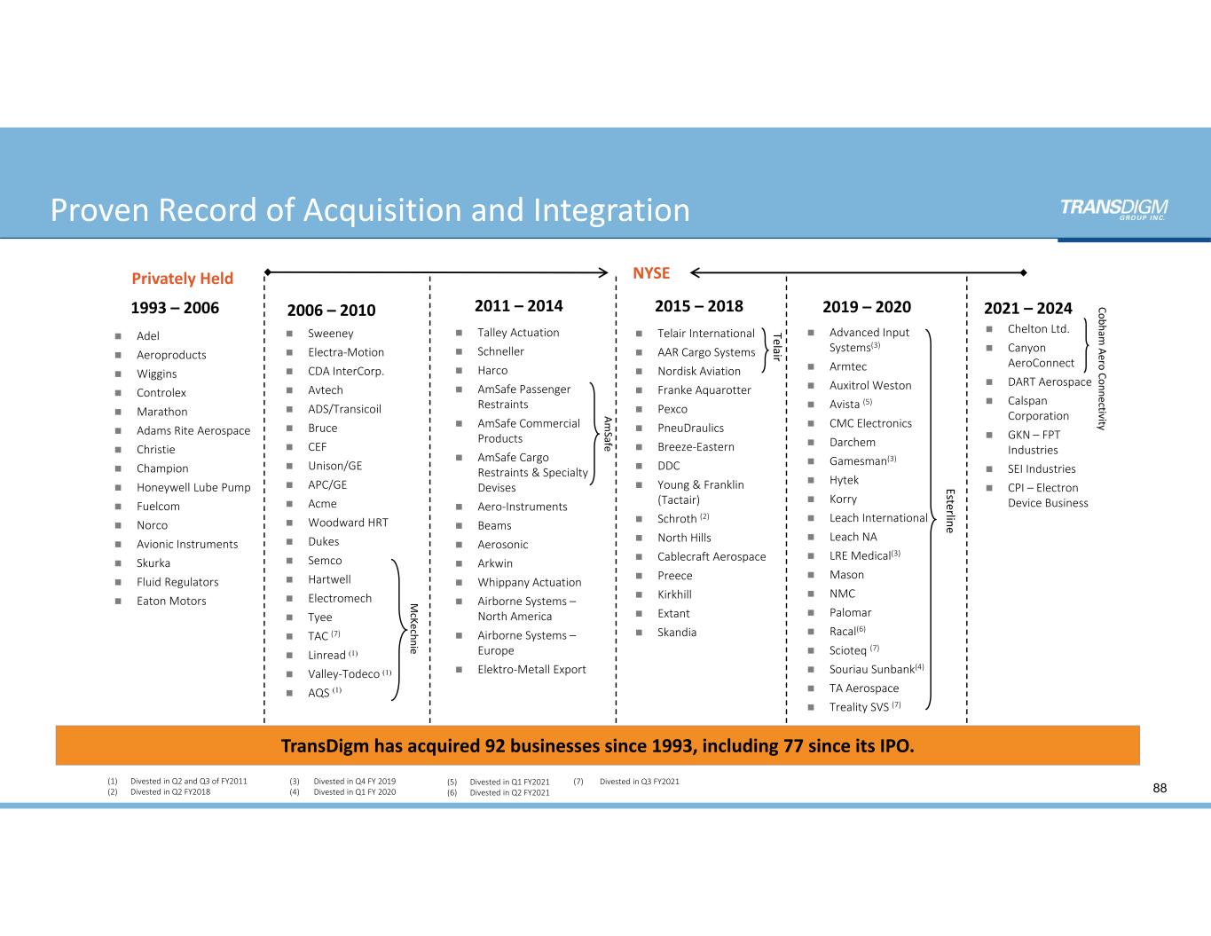1993 – 2006 2006 – 2010 2011 – 2014  Adel  Aeroproducts  Wiggins  Controlex  Marathon  Adams Rite Aerospace   Christie  Champion  Honeywell Lube Pump  Fuelcom  Norco  Avionic Instruments  Skurka  Fluid Regulators  Eaton Motors  Talley Actuation  Schneller  Harco  AmSafe Passenger  Restraints  AmSafe Commercial  Products  AmSafe Cargo  Restraints & Specialty  Devises  Aero‐Instruments  Beams  Aerosonic  Arkwin   Whippany Actuation   Airborne Systems – North America  Airborne Systems – Europe  Elektro‐Metall Export  Sweeney  Electra‐Motion  CDA InterCorp.  Avtech  ADS/Transicoil  Bruce   CEF  Unison/GE  APC/GE  Acme  Woodward HRT  Dukes  Semco  Hartwell  Electromech  Tyee  TAC (7)  Linread  Valley‐Todeco  AQS  Privately Held NYSE (1) Divested in Q2 and Q3 of FY2011         (2) Divested in Q2 FY2018 (1)  Telair International  AAR Cargo Systems  Nordisk Aviation  Franke Aquarotter  Pexco   PneuDraulics  Breeze‐Eastern  DDC  Young & Franklin  (Tactair)  Schroth (2)  North Hills  Cablecraft Aerospace  Preece  Kirkhill  Extant  Skandia M cKechnie Am Safe Telair (1) (1) 2019 – 20202015 – 2018  Advanced Input  Systems(3)  Armtec  Auxitrol Weston  Avista (5)  CMC Electronics  Darchem   Gamesman(3)  Hytek  Korry  Leach International  Leach NA  LRE Medical(3)  Mason  NMC  Palomar  Racal(6)  Scioteq (7)  Souriau Sunbank(4)  TA Aerospace  Treality SVS (7) Esterline TransDigm has acquired 92 businesses since 1993, including 77 since its IPO. Proven Record of Acquisition and Integration 2021 – 2024  Chelton Ltd.  Canyon  AeroConnect  DART Aerospace  Calspan  Corporation  GKN – FPT  Industries  SEI Industries  CPI – Electron  Device Business (5) Divested in Q1 FY2021 (6) Divested in Q2 FY2021 Cobham  Aero Connectivity 88(3)       Divested in Q4 FY 2019 (4)       Divested in Q1 FY 2020 (7)        Divested in Q3 FY2021