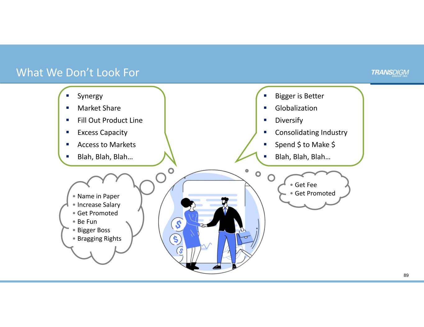 What We Don’t Look For 89  Synergy  Market Share  Fill Out Product Line  Excess Capacity  Access to Markets  Blah, Blah, Blah… • Name in Paper • Increase Salary • Get Promoted • Be Fun • Bigger Boss • Bragging Rights  Bigger is Better  Globalization  Diversify  Consolidating Industry  Spend $ to Make $  Blah, Blah, Blah… • Get Fee • Get Promoted