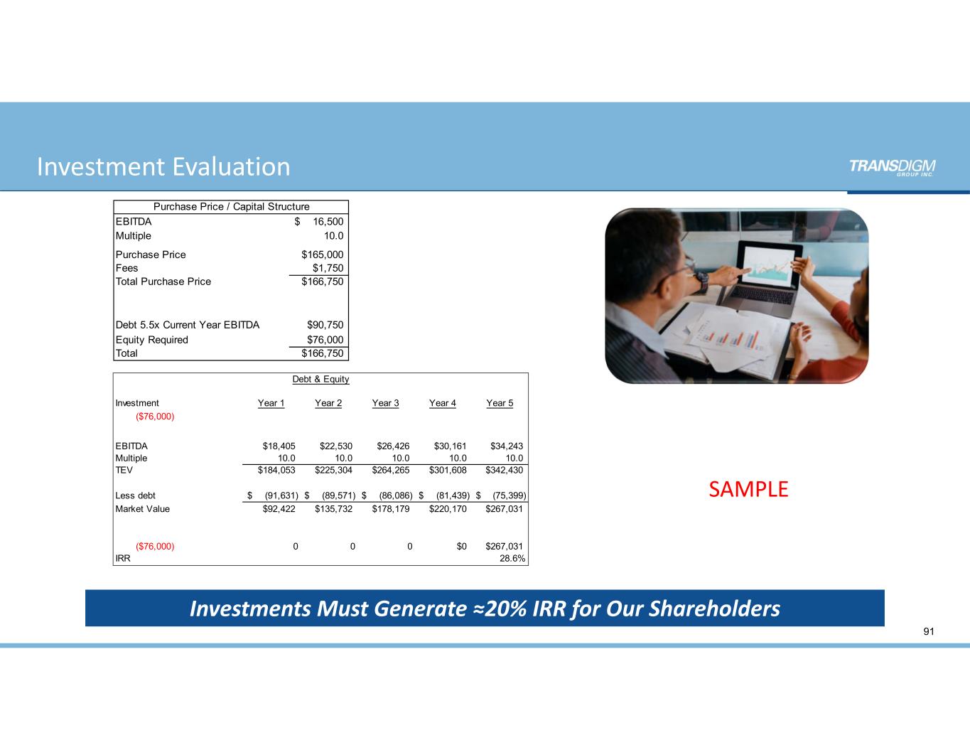 Investment Evaluation 91 SAMPLE Investment Year 1 Year 2 Year 3 Year 4 Year 5 ($76,000) EBITDA $18,405 $22,530 $26,426 $30,161 $34,243 Multiple 10.0 10.0 10.0 10.0 10.0 TEV $184,053 $225,304 $264,265 $301,608 $342,430 Less debt (91,631)$ (89,571)$ (86,086)$ (81,439)$ (75,399)$ Market Value $92,422 $135,732 $178,179 $220,170 $267,031 ($76,000) 0 0 0 $0 $267,031 IRR 28.6% Debt & Equity EBITDA 16,500$ Multiple 10.0 Purchase Price $165,000 Fees $1,750 Total Purchase Price $166,750 Leverage Multiple 5.5 Debt 5.5x Current Year EBITDA $90,750 Equity Required $76,000 Total $166,750 Purchase Price / Capital Structure Investments Must Generate ≈20% IRR for Our Shareholders