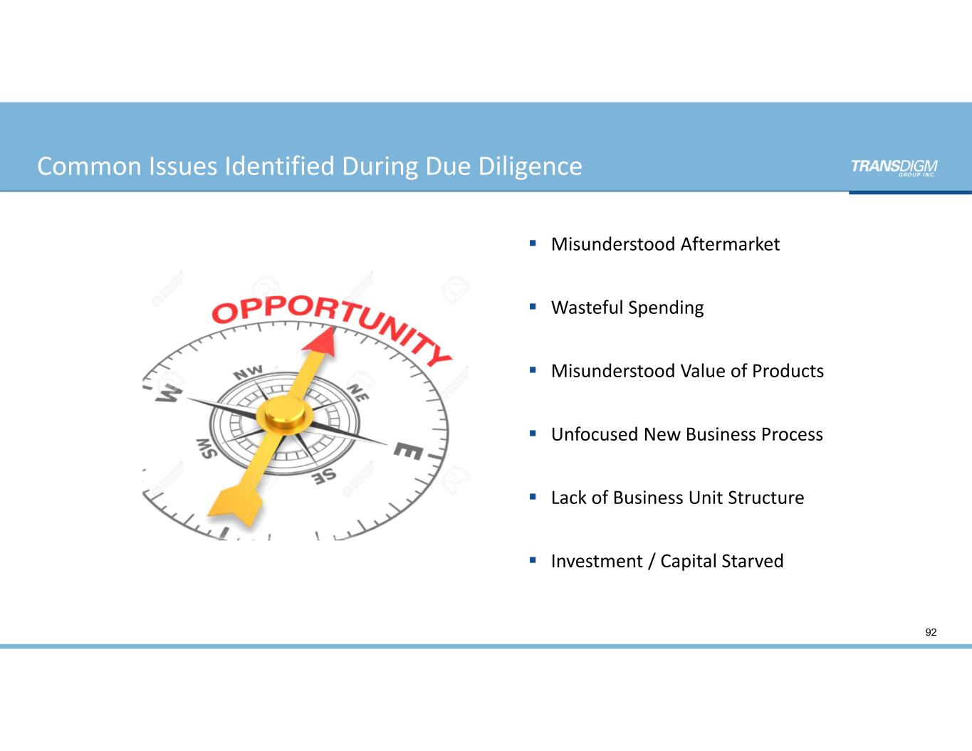 Common Issues Identified During Due Diligence 92  Misunderstood Aftermarket  Wasteful Spending  Misunderstood Value of Products  Unfocused New Business Process  Lack of Business Unit Structure  Investment / Capital Starved
